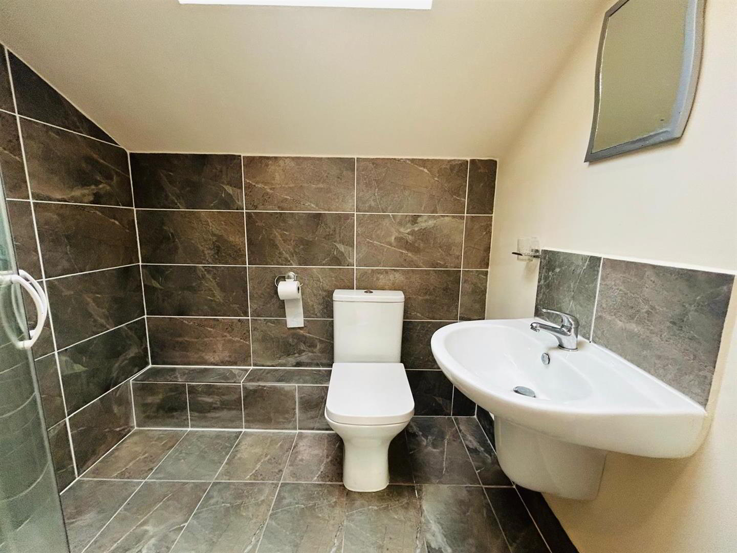 Comprising fully tiled walk in electric shower, whb with mixer taps and tiling around, wc, partly tiled walls, tiled floor.