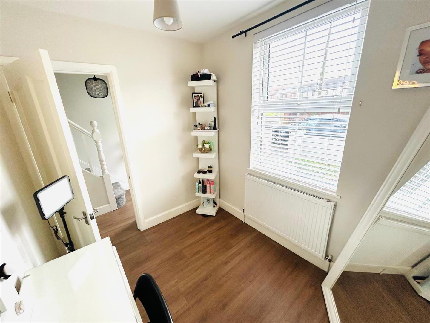 Having understairs storage with light, laminated wooden floor.