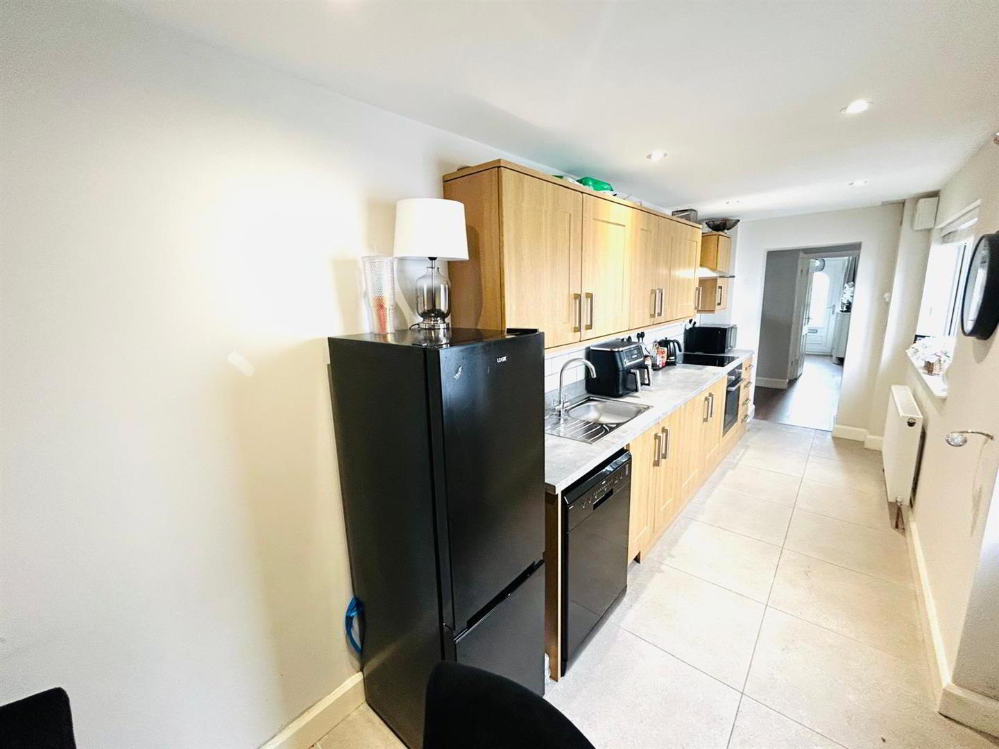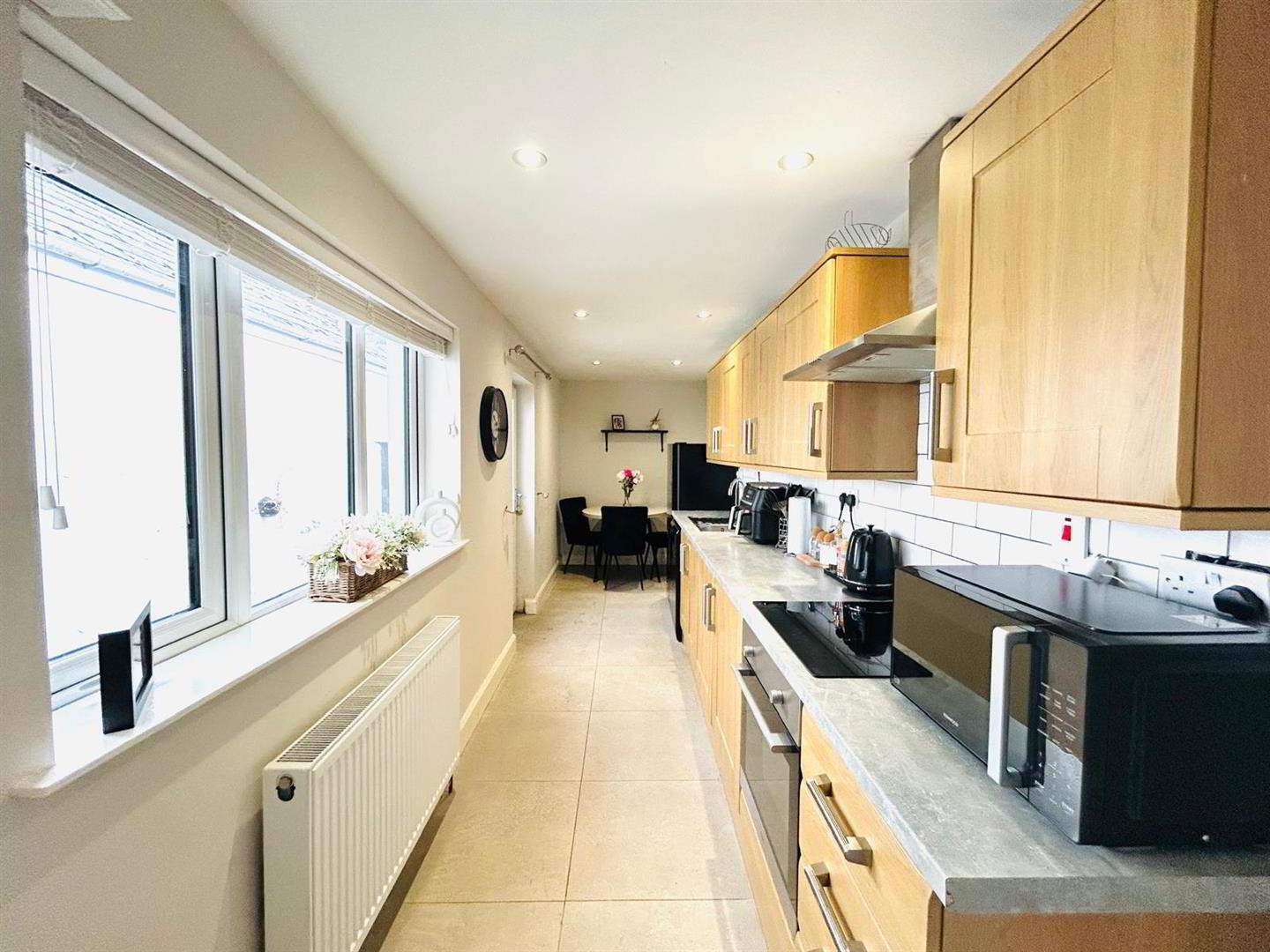 Having eye and low level units, tiling between units, integrated hob and oven, stainless steel extractor hood, space for fridge/freezer, plumbed for dishwasher, recessed lighting, tiled floor.