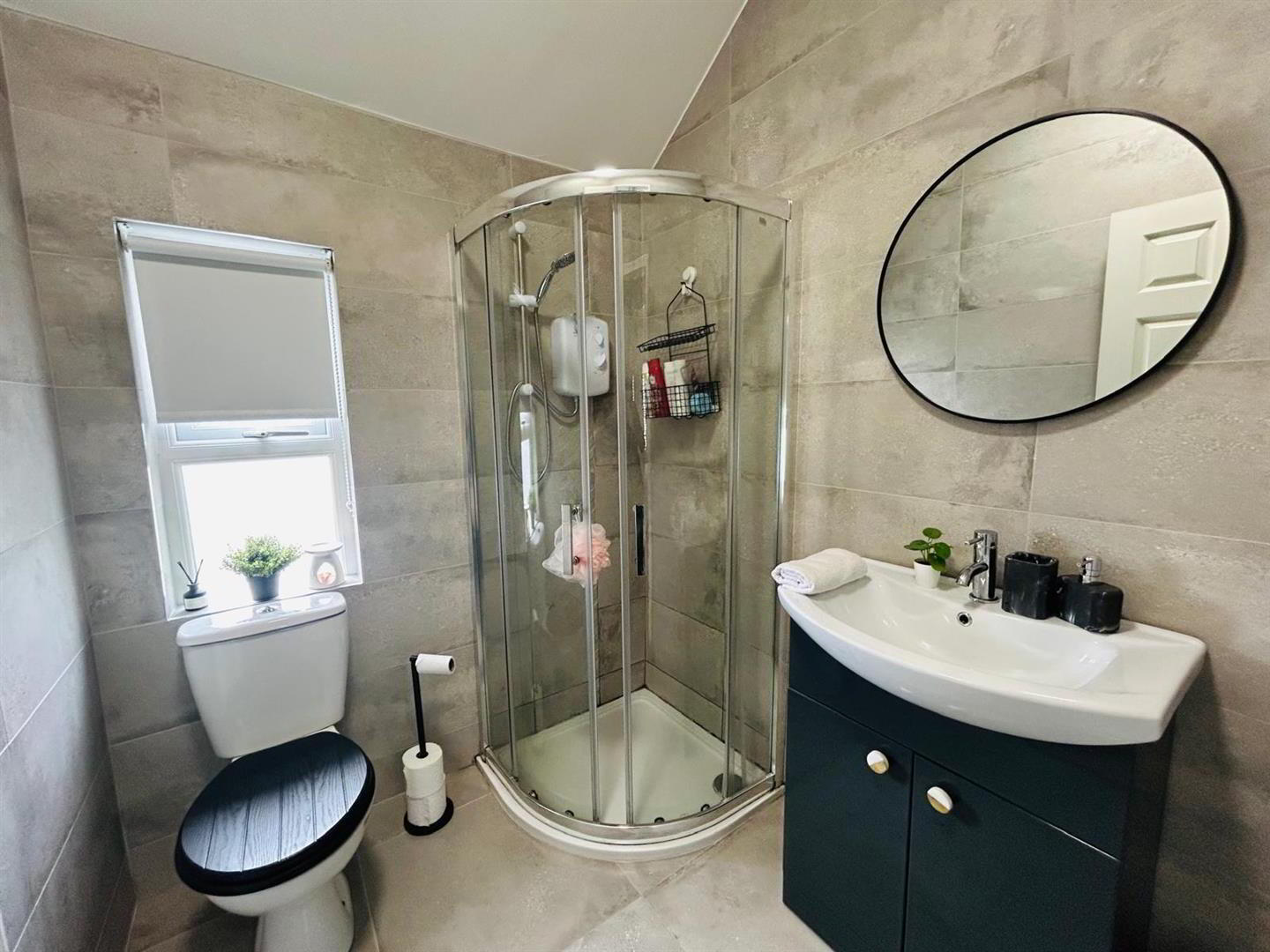 Comprising fully tiled walk in electric shower, whb with mixer taps set in vanity unit, wc, fully tiled walls and floor.