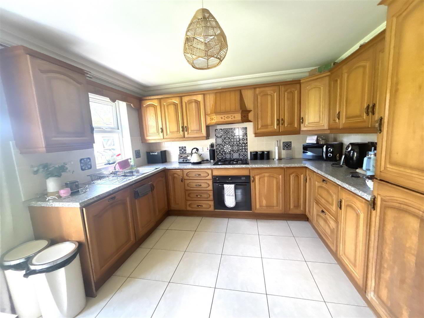 Fitted with a range of eye and low level units with matching work top. Tiled around units. Stainless steel sink unit. Gas hob and electric oven. Extractor fan and light. Pelmet over window. Tiled flooring. PVC patio doors to enclosed rear garden.