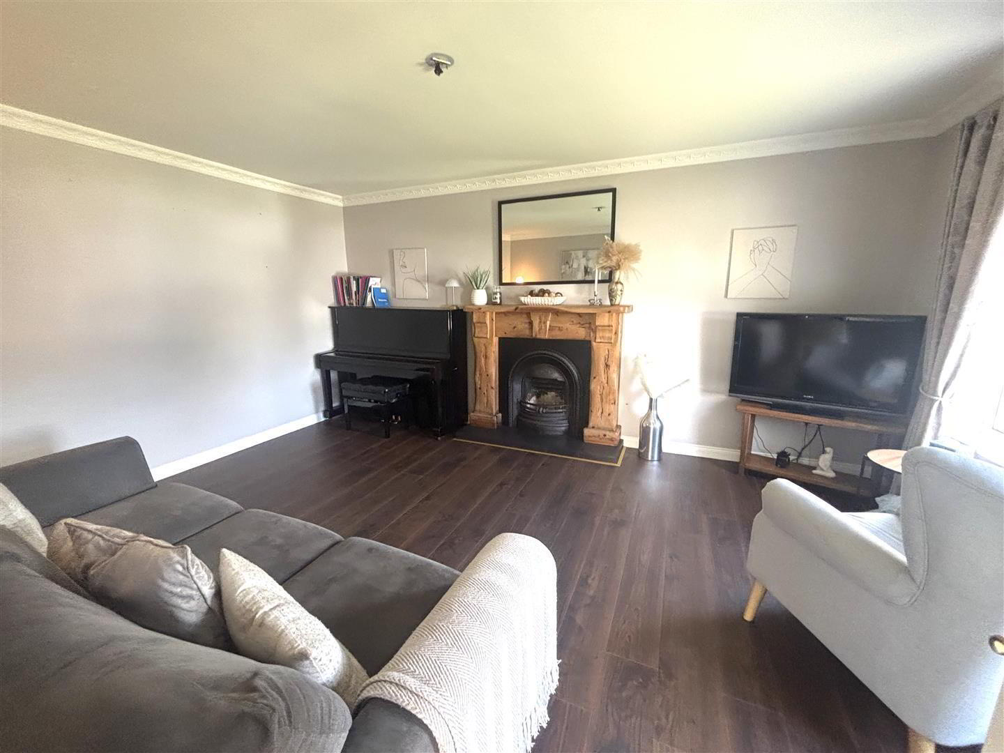 Pine fireplace with cast iron inset and tiled hearth. Coving around ceiling. Laminate flooring.