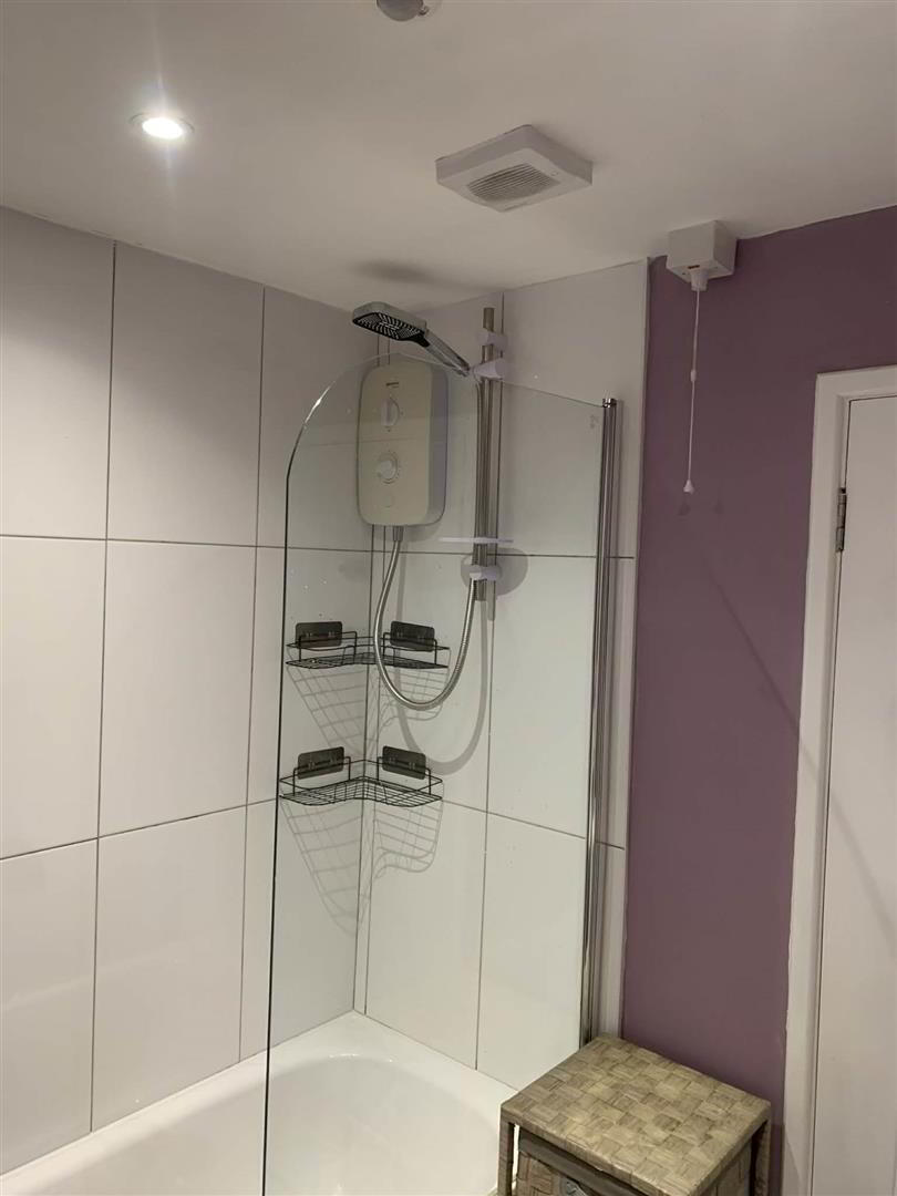 Fitted white bath with electric shower over bath. Pedestal wash hand basin. Low Flush W.C. Extractor fan. Cushion flooring. Part tiled walls.