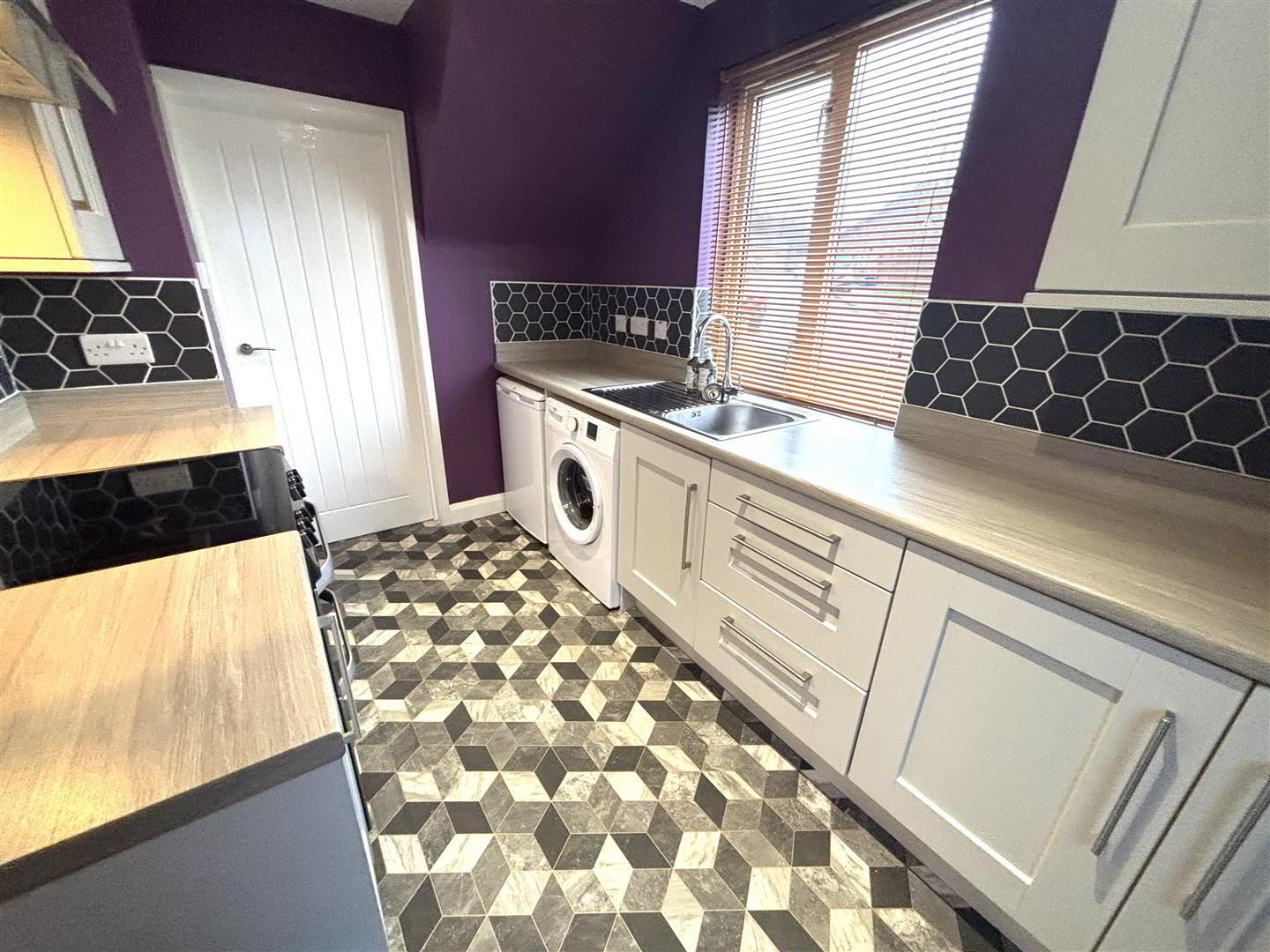 Fitted with a range of eye and low level units with matching work top. Tiled around units. Stainless steel sink unit. Stainless steel extractor fan and light. Space for fridge freezer. Plumbed for automatic washing machine. Stainless steel splash back. Cooker point. Cushion flooring.