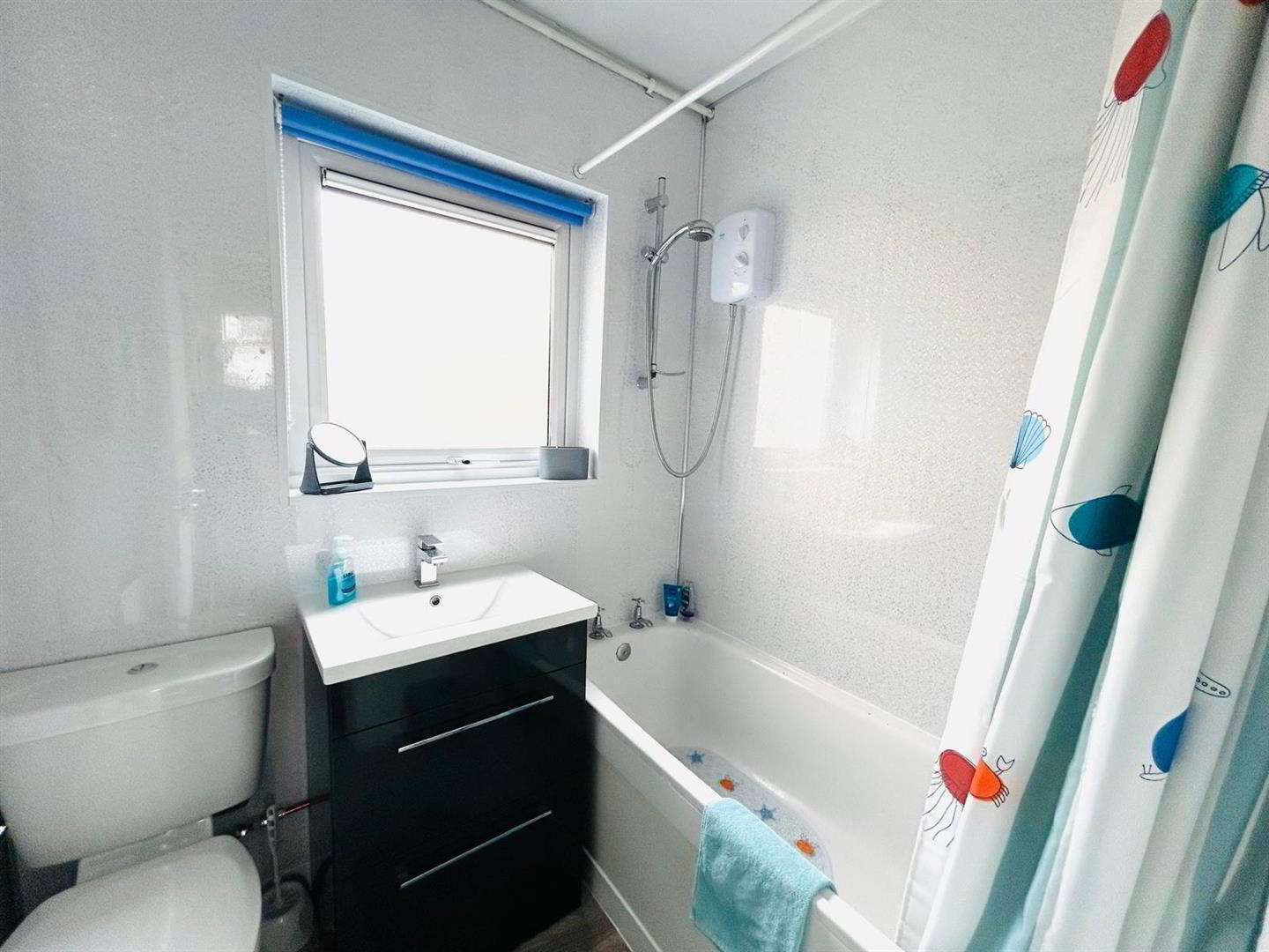 Comprising bath with shower over, whb set in vanity unit, wc, PVC cladding to walls, laminated wooden floor.