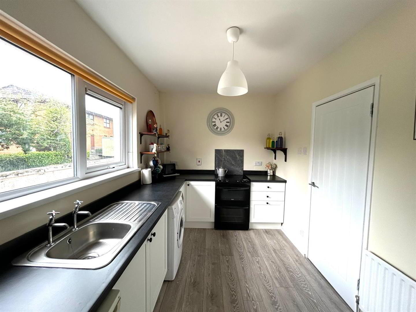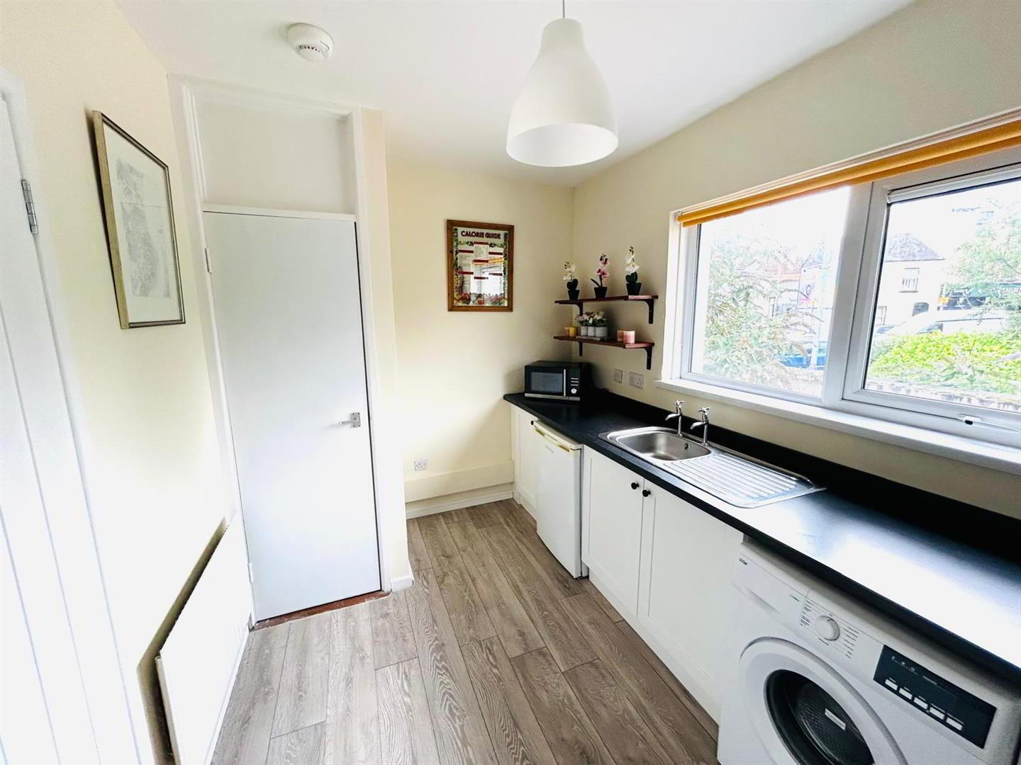 Having low level units, single drainer stainless steel sink unit, wired for cooker, plumbed for washing machine, space for fridge, storage cupboard, laminated wooden floor.