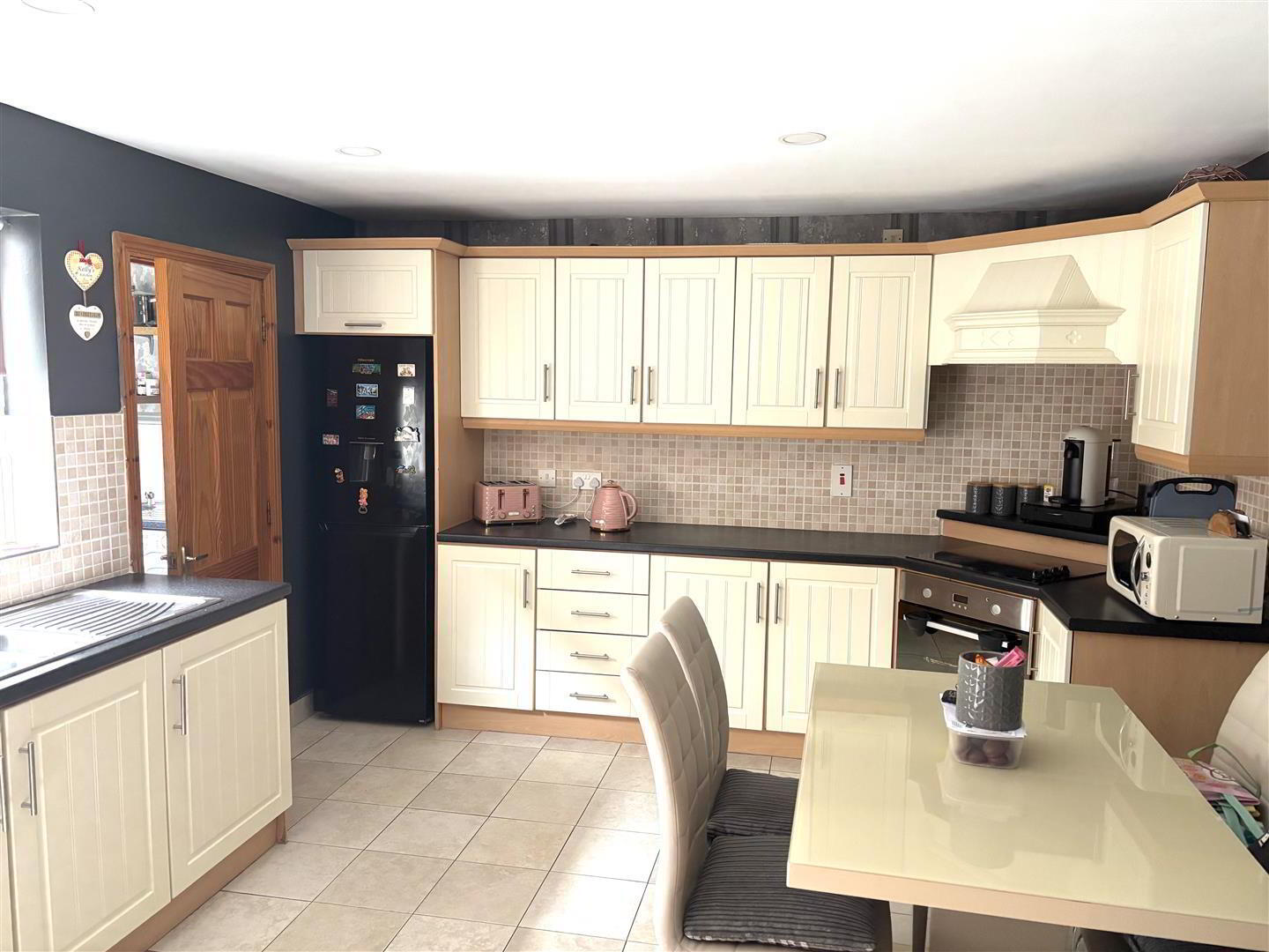 Fitted with a range of eye and low level units with matching worktop. Tiled around units. Stainless steel sink unit. Extractor fan and light. Tiled flooring. Double UPVC doors to enclosed rear yard.