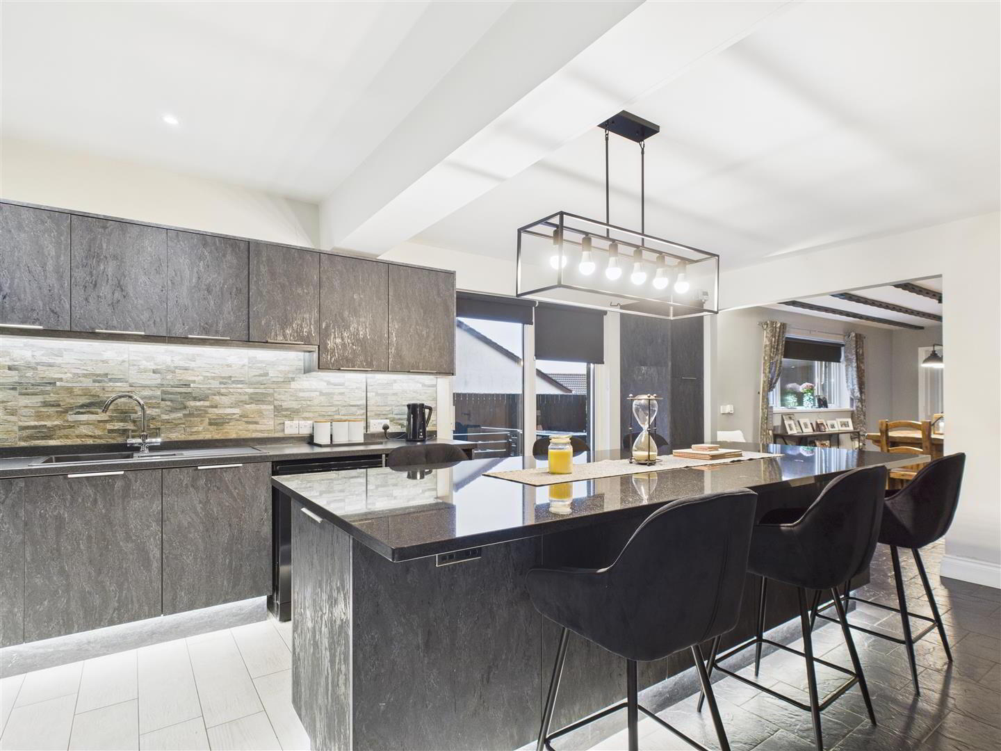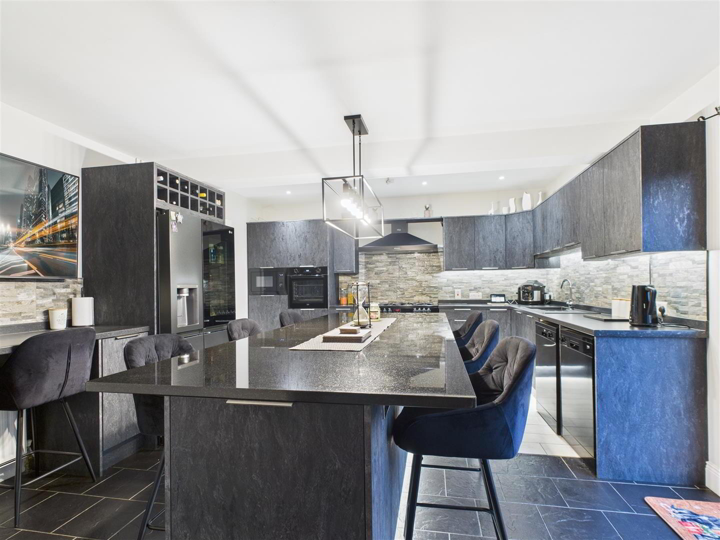 with a wide range of modern eye and low level soft closing units, matching worktop, tiled around units, under-unit lighting, composite sink unit, built-in oven and microwave, space for range cooker, black Beling extractor fan with light, plumbed for American fridge/freezer, plumbed for two dishwashers, feature wine display rack, breakfast bar, centre island with hidden cupboard for bins and low level units, recess down-lighters to ceiling, dimmer switch, sliding doors to rear decked area.