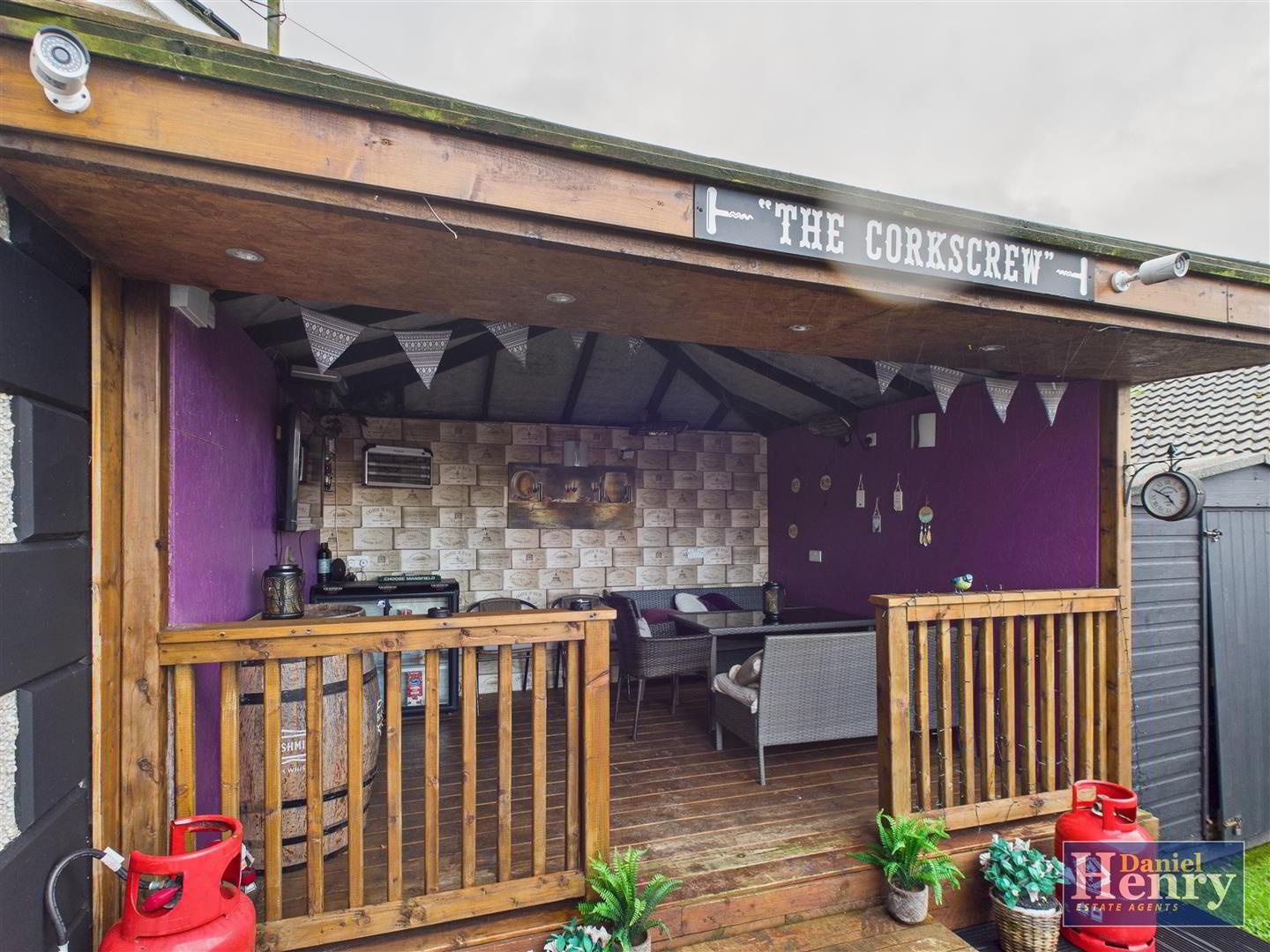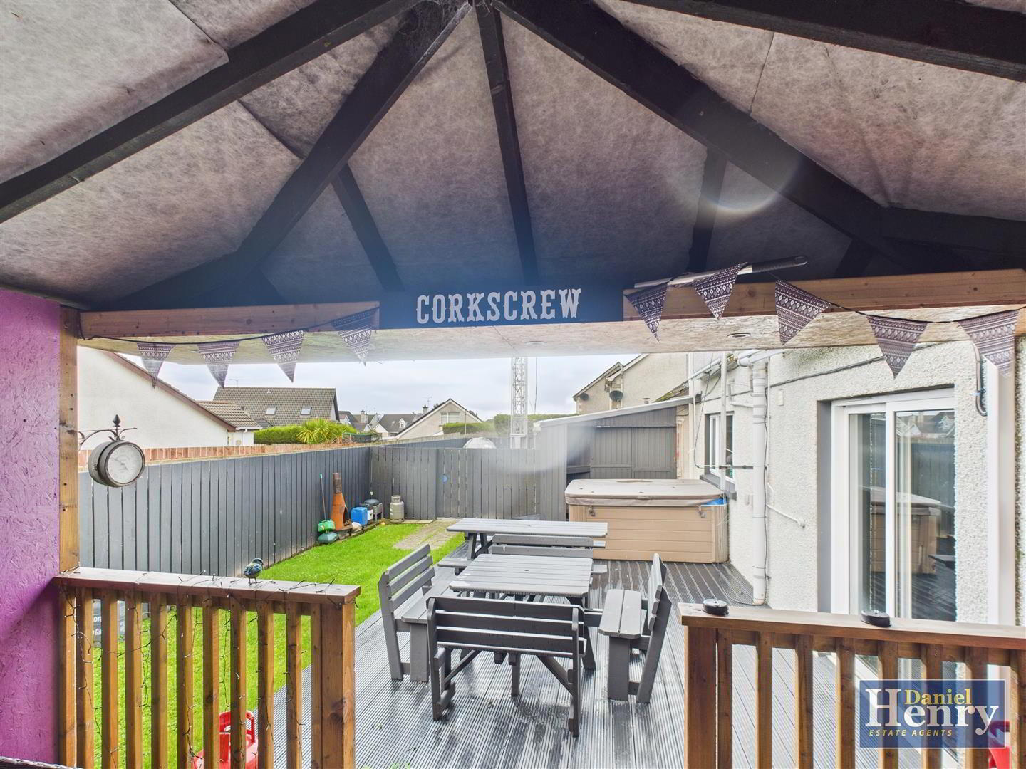 Garden to rear laid in lawn and enclosed by high wooden fencing. Two retractable canopies. Shed. Wooden decked area with step-up to covered seating area 'The Corkscrew': having lighting, power points and electric heaters.