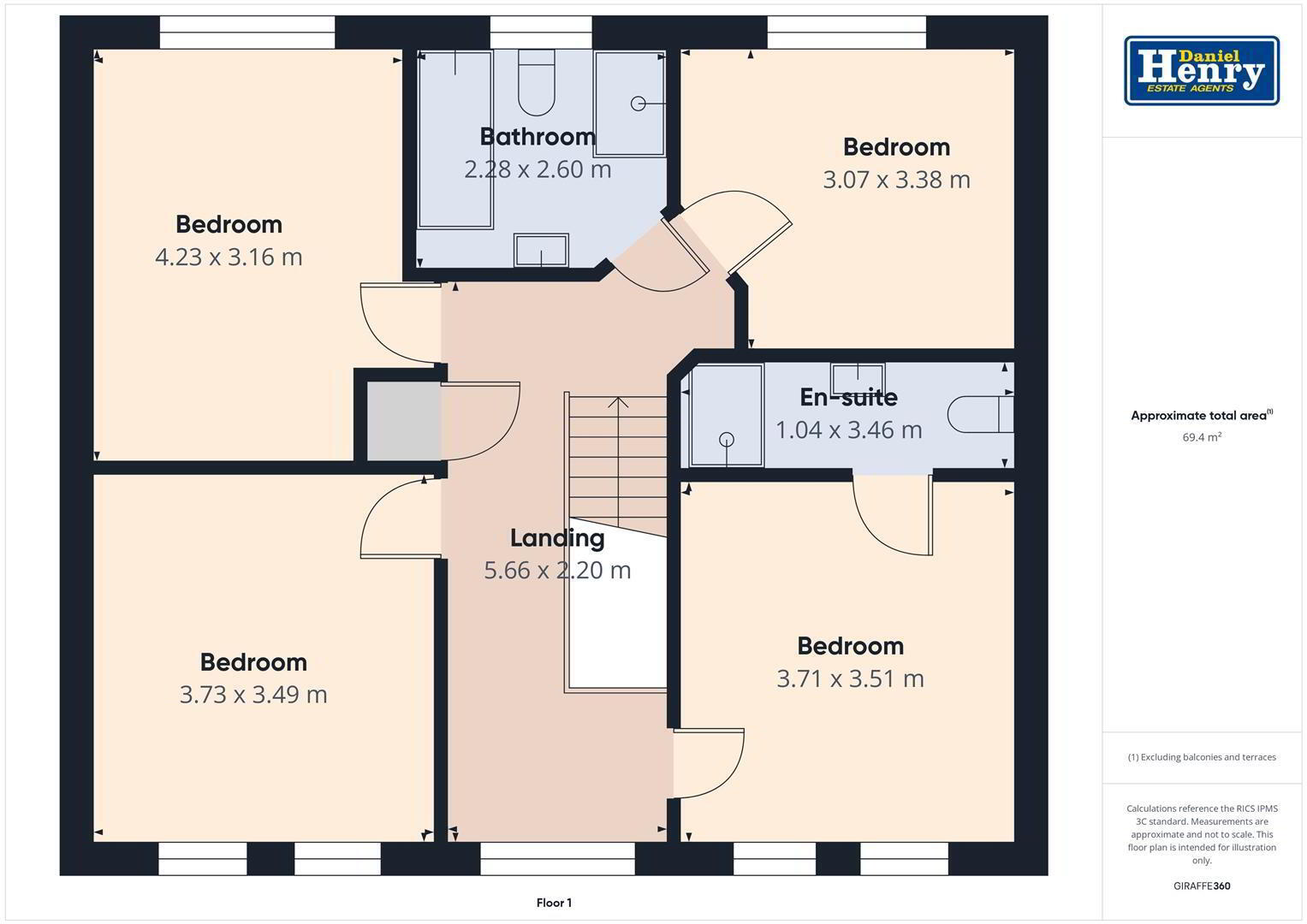 with t.v. point. EN-SUITE: 1.04m x 3.46m having fully tiled shower cubicle with electric shower, pedestal wash hand basin, low flush w.c., extractor fan, fully tiled walls, tiled flooring.