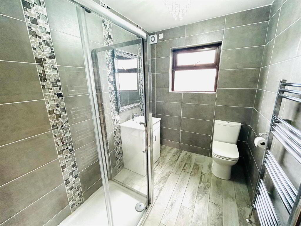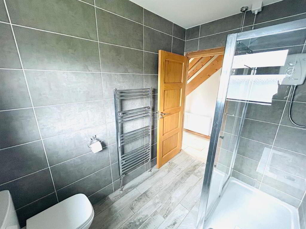 Comprising walk in electric shower, whb set in vanity unit, wc, chrome radiator, fully tiled walls and floor.
