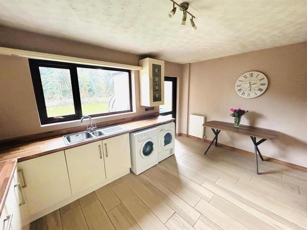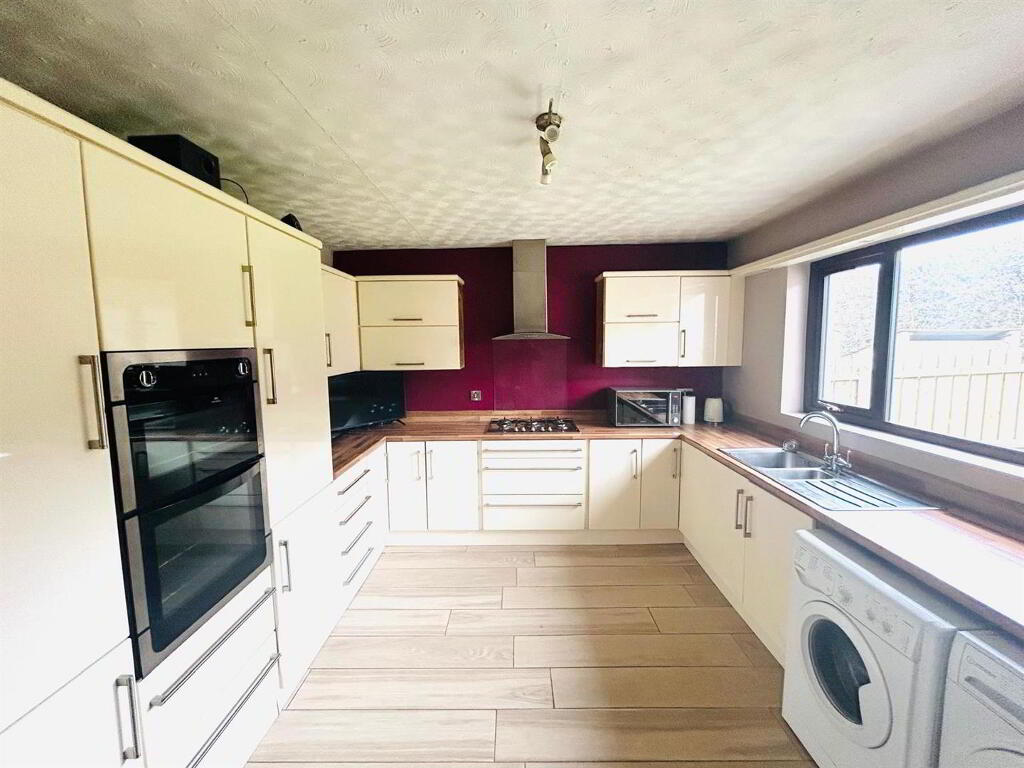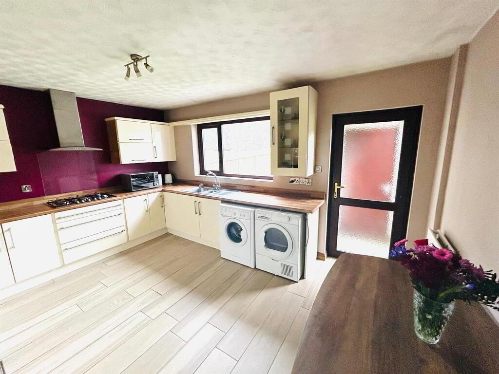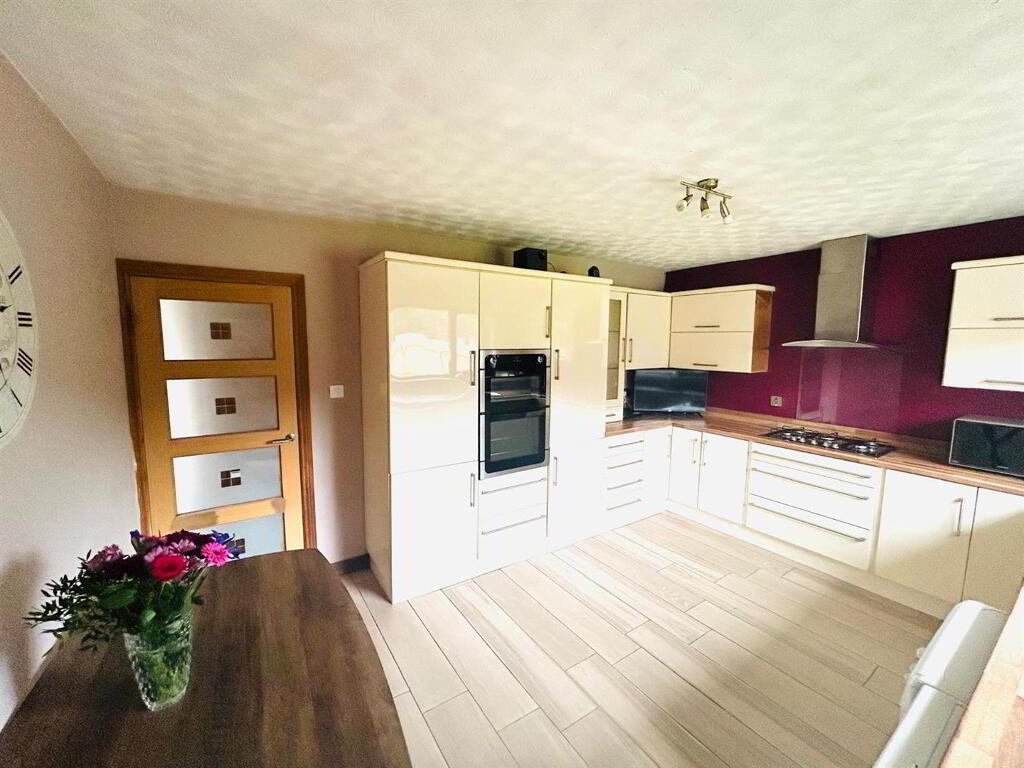 Having excellent range of eye and low level units, 1 1/2 bowl stainless steel sink unit with mixer taps, 5 ring gas hob, double electric oven, stainless steel extractor hood, plumbed for washing machine, space for tumble dryer, integrated fridge / freezer, tiled floor.
