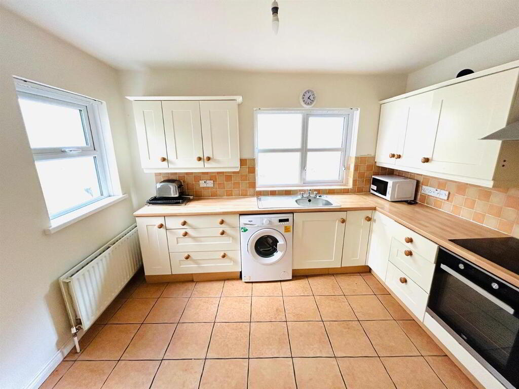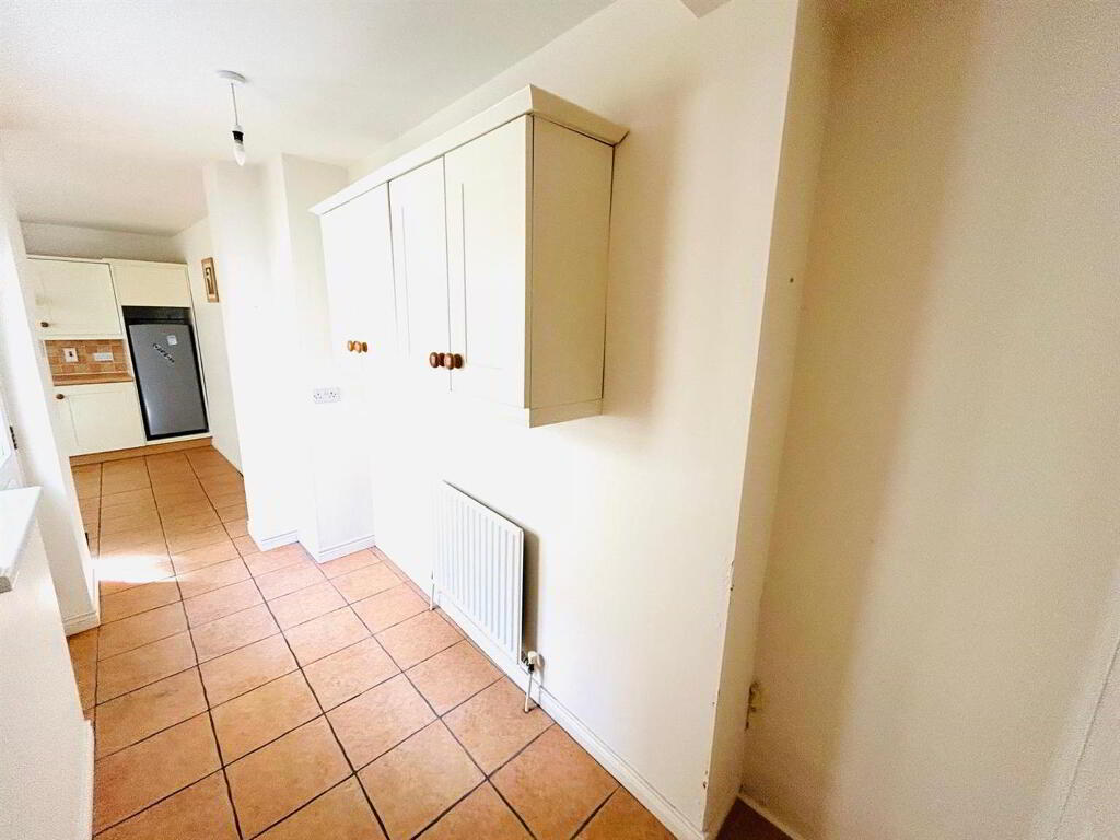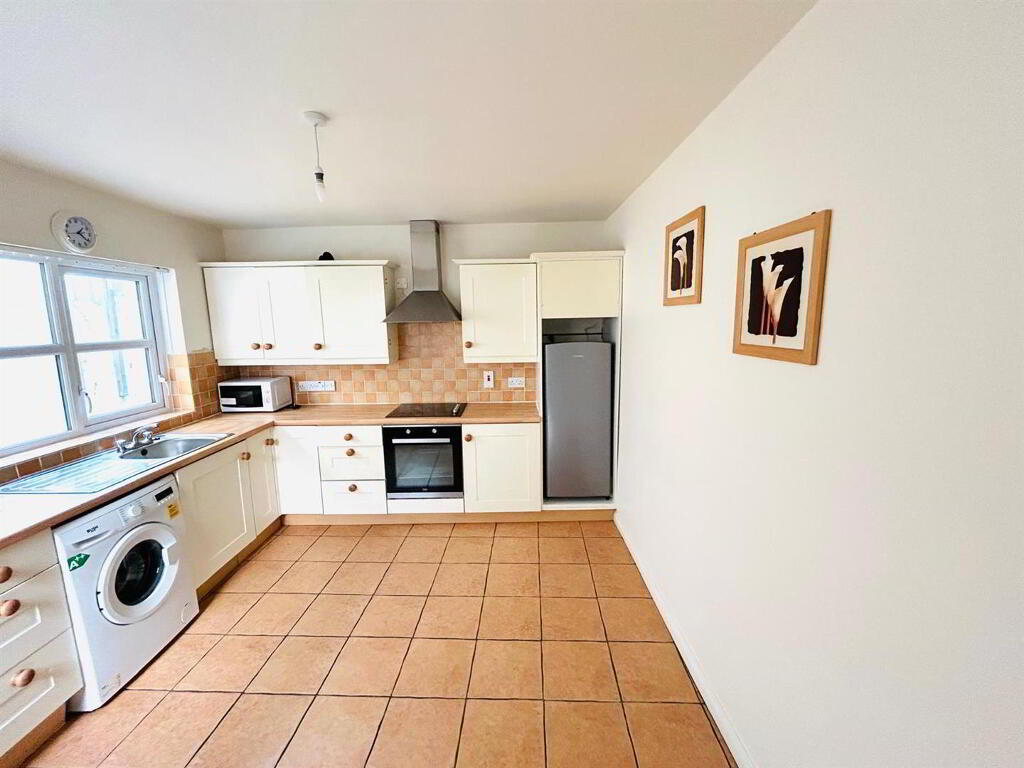 Having eye and low level units, tiling between units, single drainer stainless steel sink unit with mixer taps, integrated hob and underoven, stainless steel extractor hood, plumbed for washing machine, space for fridge / freezer, tiled floor.