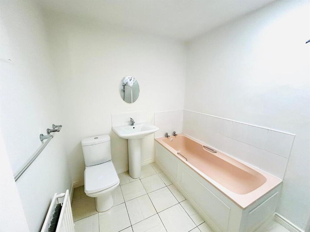 Comprising bath with tiling around, whb with mixer taps and tiling around, wc, fully tiled walk in electric shower, tiled floor.