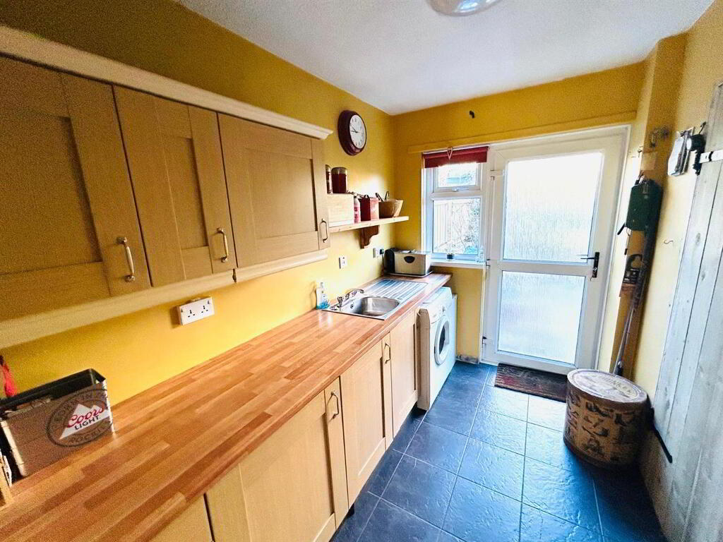 Having eye and low level units, single drainer stainless steel sink unit with mixer taps, plumbed for washing machine, tiled floor.