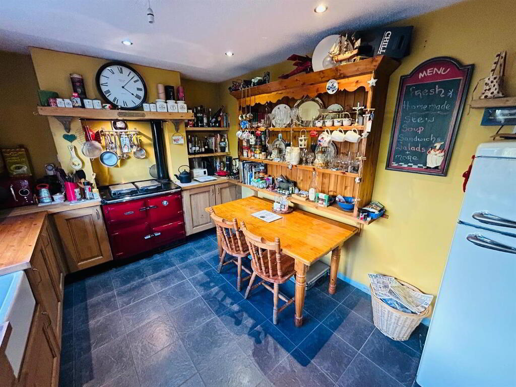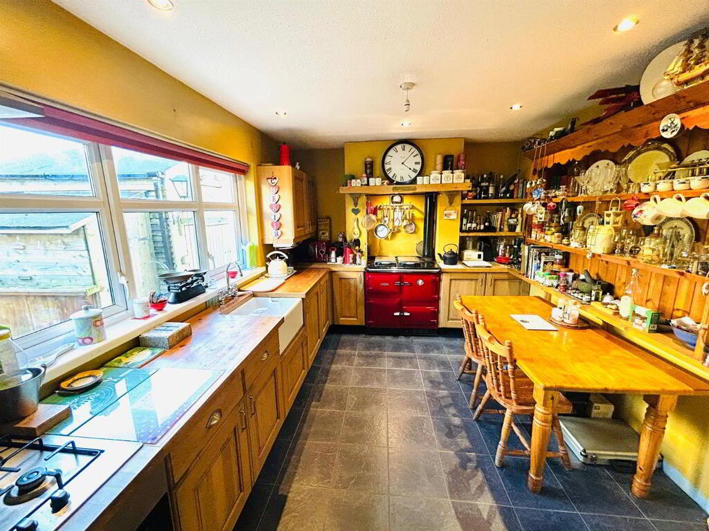 Having eye and low level units, Belfast sink unit with mixer taps, gas hob, electric underoven, space for fridge / freezer, plumbed for Rayburn cooker, tiled floor.