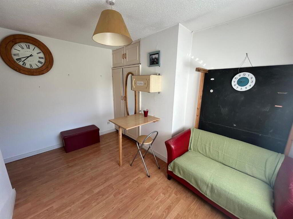 Having fireplace with cast iron inset and tiled hearth, black surround, laminated wooden floor.