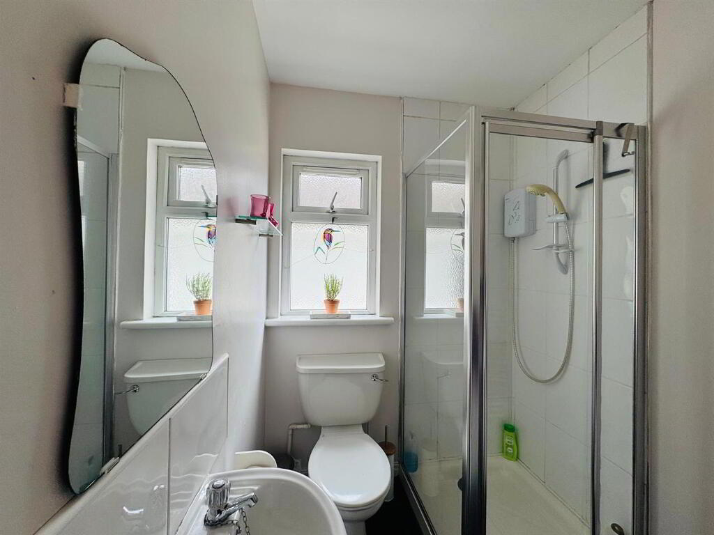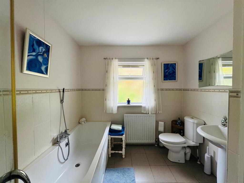 Comprising bath wth shower attachment to taps, whb and wc, fully tiled walk in shower, hotpress, 1/2 tiled walls, tiled floor.