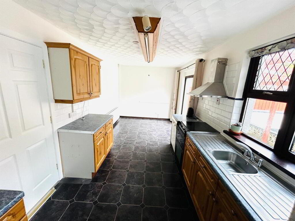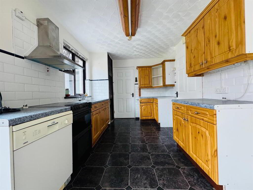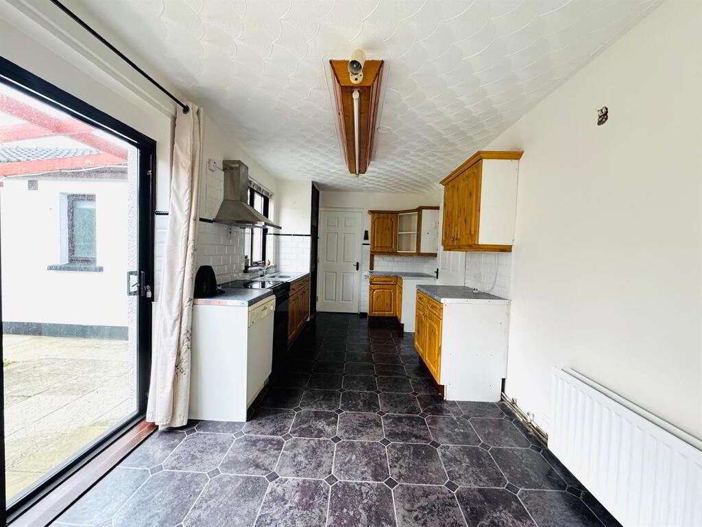 Having eye and low level units, tiling between units, double drainer stainless steel sink unit with mixer taps, wired for cooker, stainless steel extractor hood, plumbed for washing machine and dishwasher, patio doors.