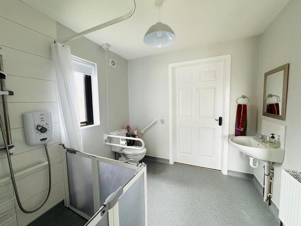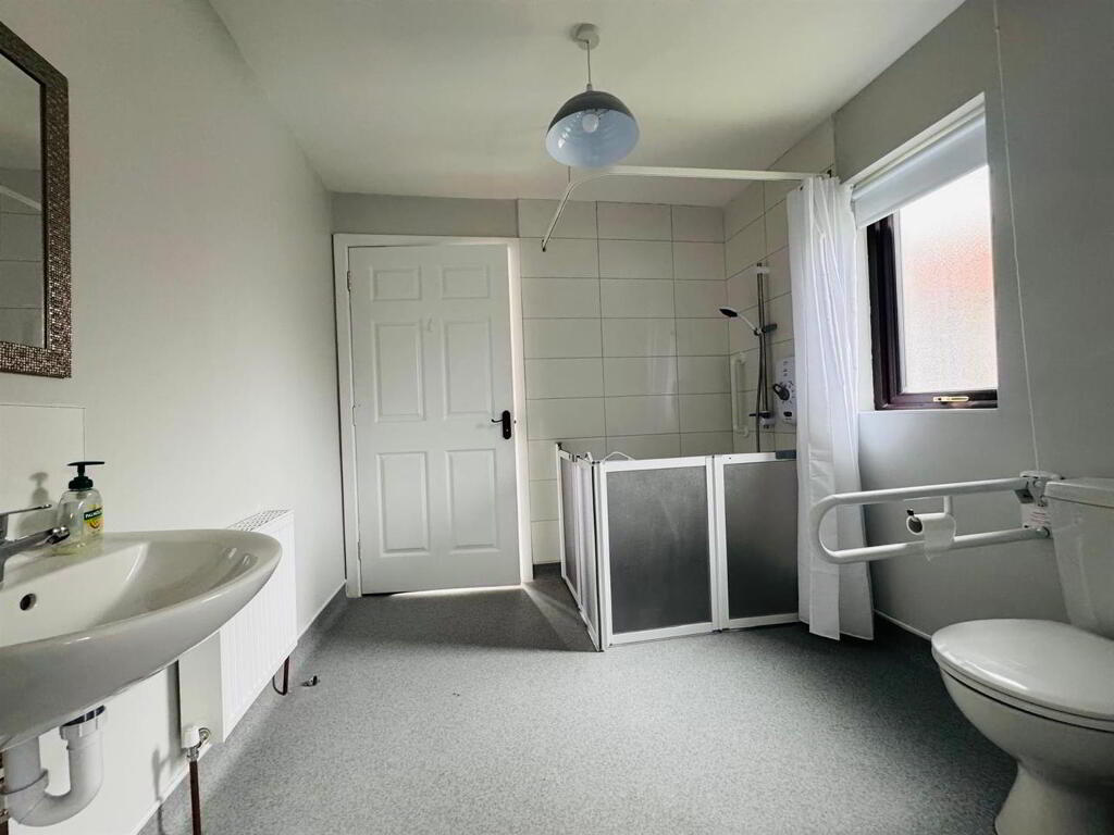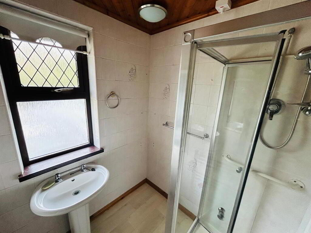 Comprising walk in shower with PVC cladding to walls, wc, wooden ceiling, chrome towel rail, fully tiled walls.