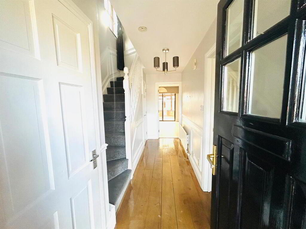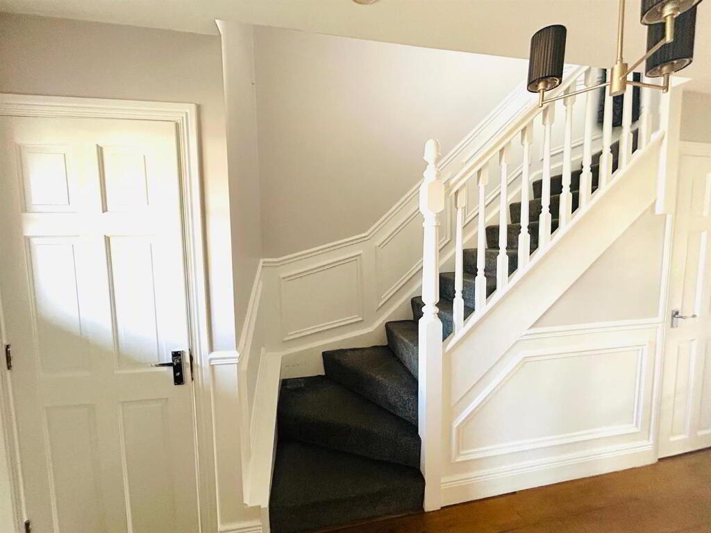 Having understairs storage, 1/2 height wooden panelled walls, wooden floor.