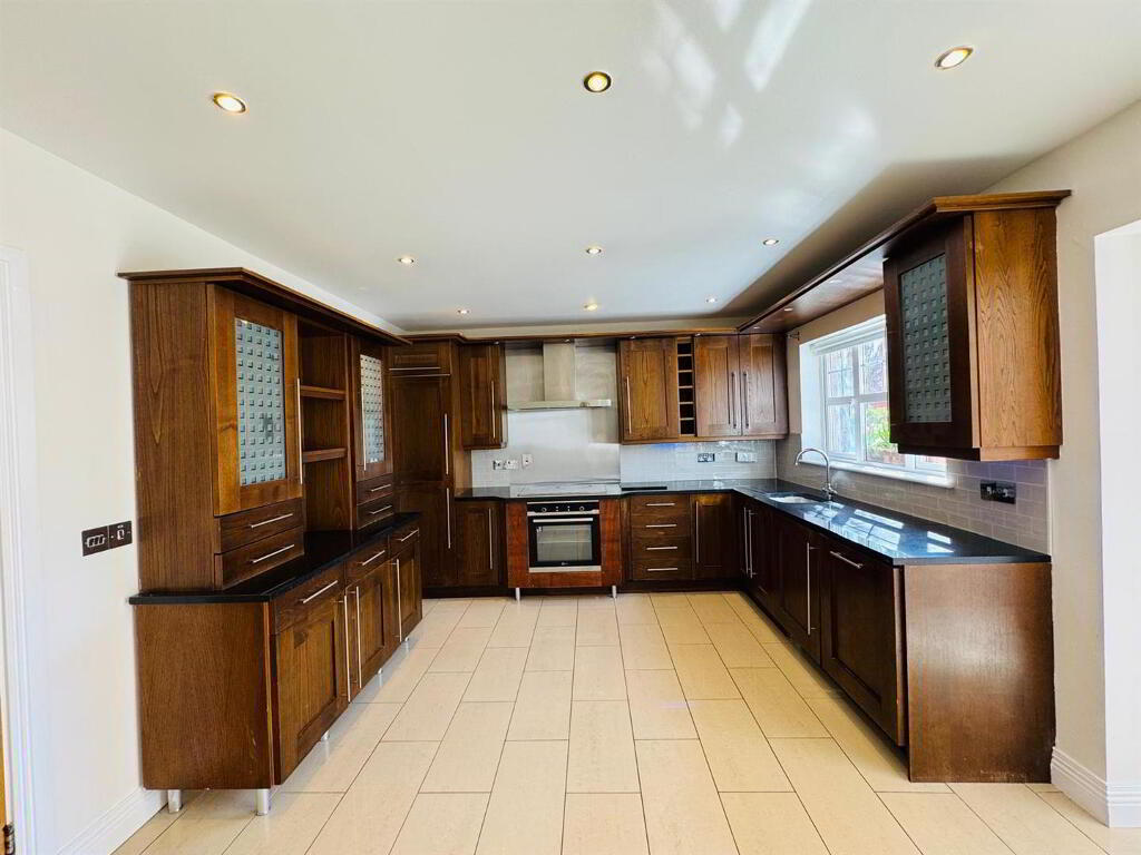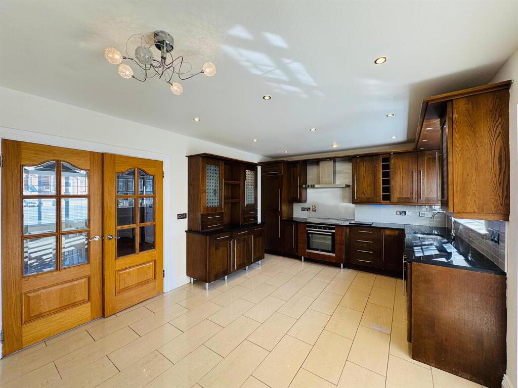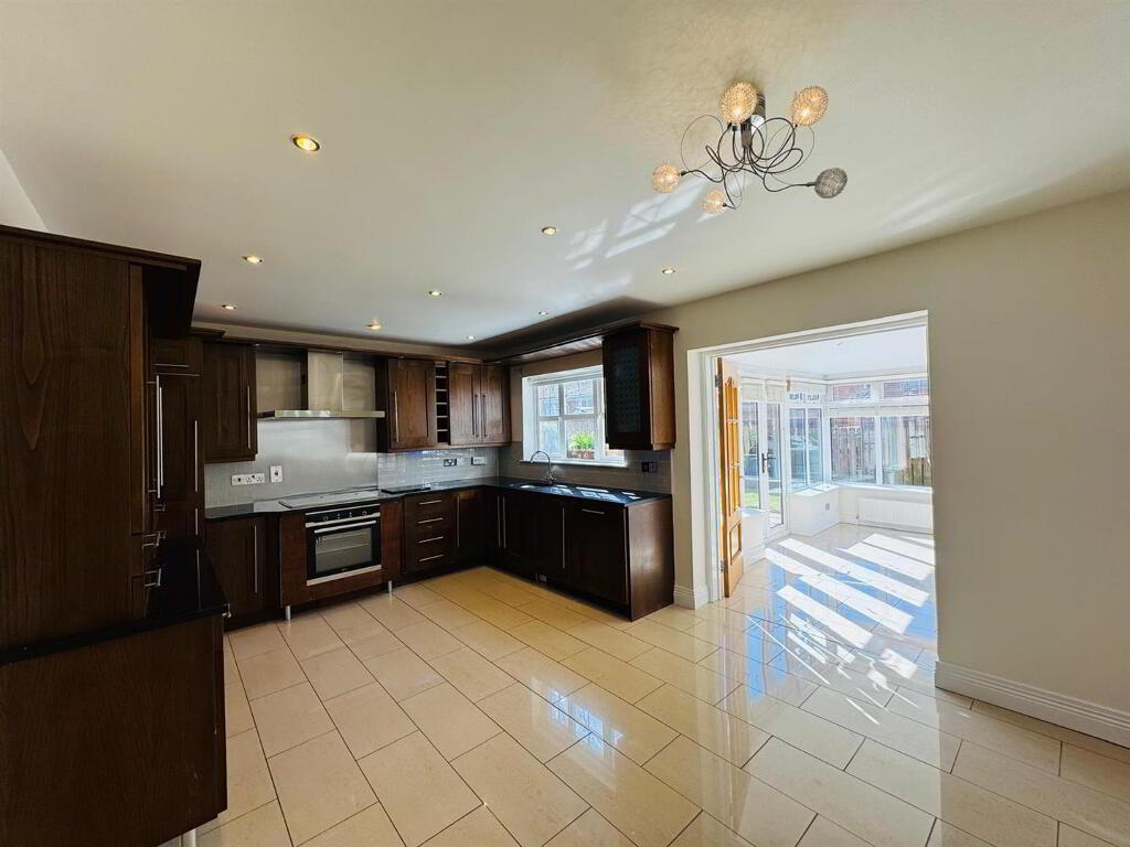 Having eye and low level units, tiling between units, matching dresser and window pelmet with feature lighting, single drainer stainless steel sink unit with mixer taps set in granite worktop, integrated hob and underoven, stainless steel extractor hood and splashback, integrated fridge / freezer and dishwasher, recessed lighting, ample dining space, tiled floor, double doors to Sun Room.