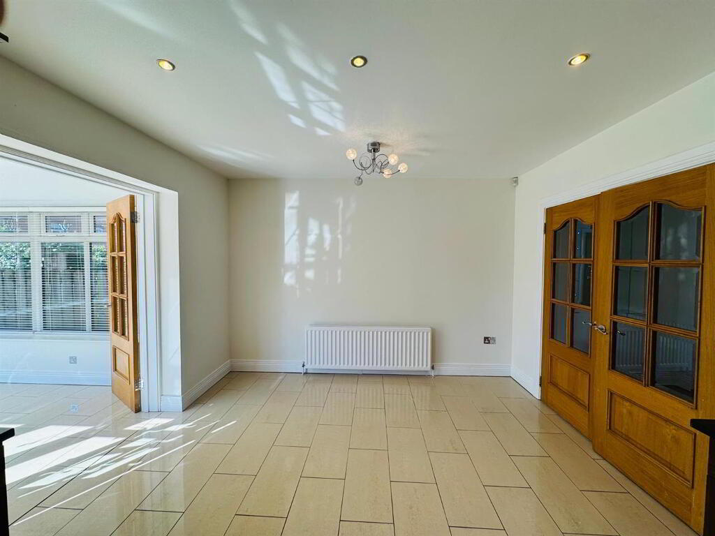 Having understairs storage, ceiling cornicing, recessed lighting, wooden floor with feature lighting, double doors to Kitchen.