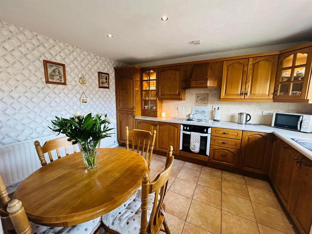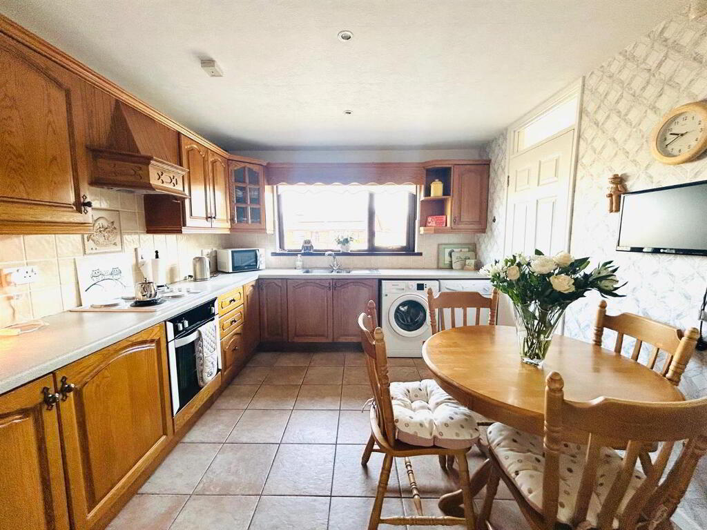 Having eye and low level units, glazed display units, matching window pelmet, 1 1/2 bowl stainless steel sink unit with mixer taps, hob and underoven, extractor hood, integrated fridge / freezer, plumbed for washing machine, space for tumble dryer, recessed lighting, tiled floor.