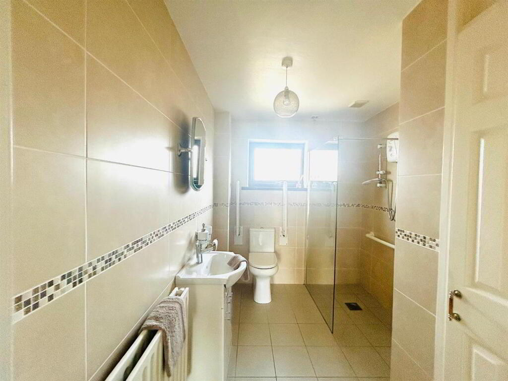 Comprising walk in electric shower, whb set in vanity unit, wc, hotpress, fully tiled walls and tiled floor.
