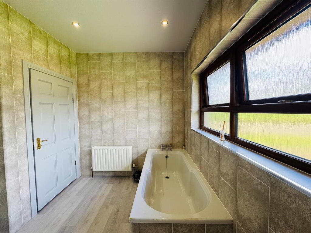 Comprising bath, whb and wc, recessed lighting, cladding to walls, laminate tiled floor.