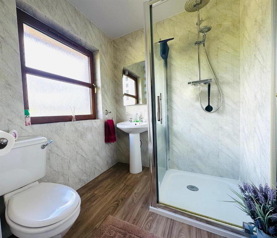 Comprising bath with mixer taps, whb set in vanity unit, wc, walk in double width shower, recessed lighting, PVC cladding to walls, laminated floor.
