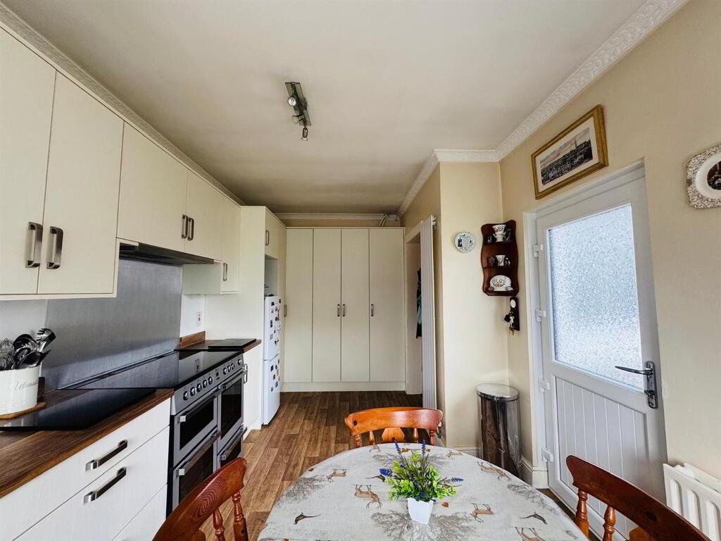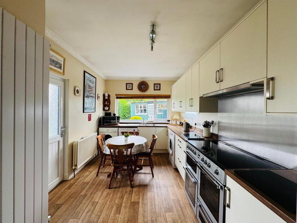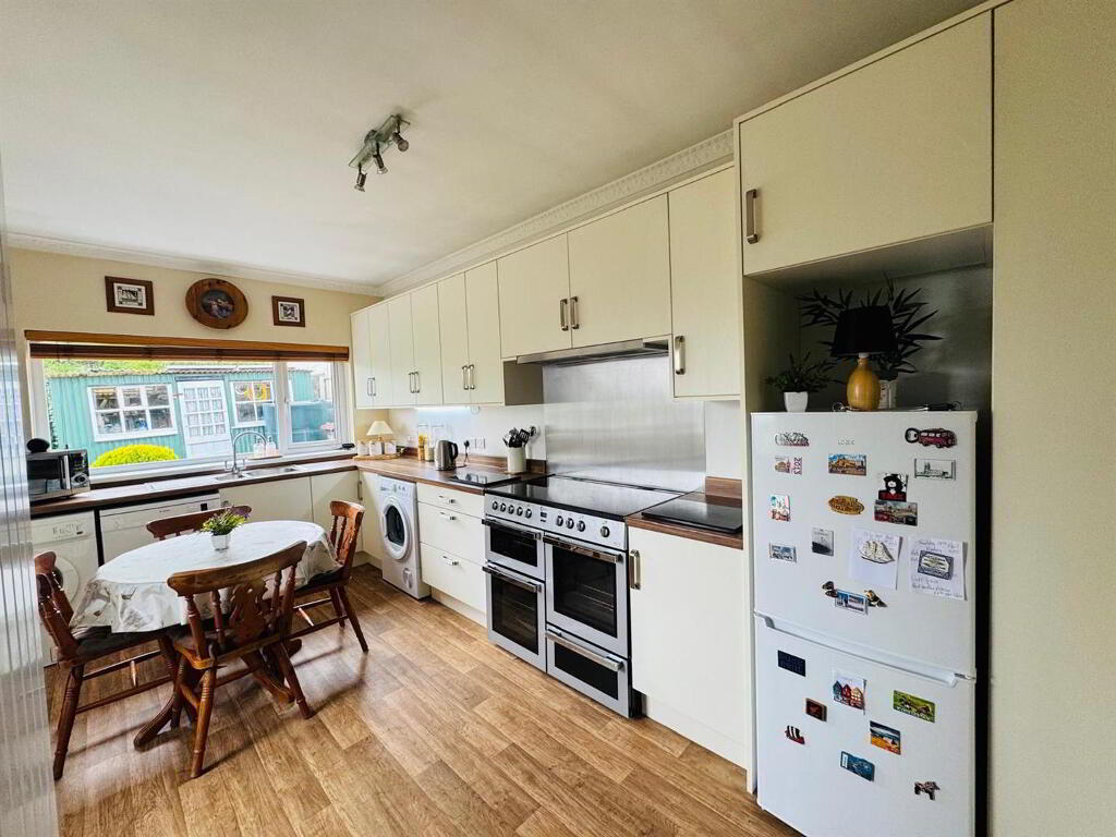 Having range of eye and low level units, 1 1/2 bowl stainless steel sink unit with mixer taps, 'Flavel' cooking centre, extractor hood, plumbed for washing machine and dishwasher, space for fridge/freezer, dining space.