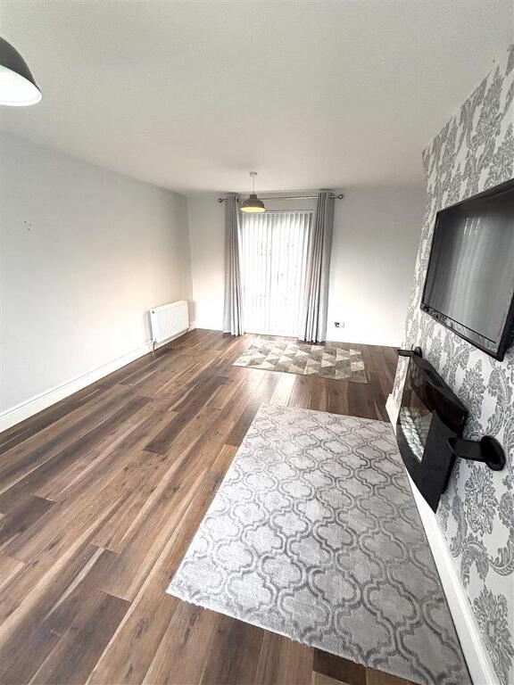 (dual aspect lounge) with electric fire, wood effect laminate flooring, telephone point, UPVC patio doors to raised decked area in rear garden.
