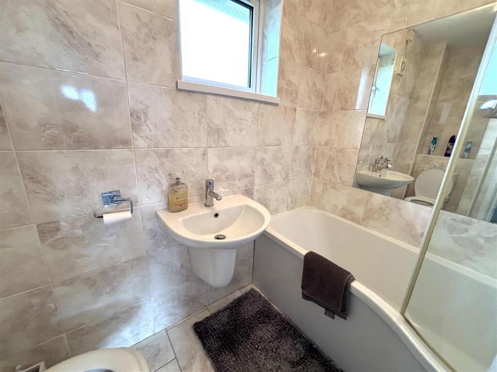 with three piece suite comprising of fitted bath with electric shower overhead, wall mounted wash hand basin, low flush w.c. Also having extractor fan, stainless Steel room heater, wall mirror, fully tiled walls, tiled flooring.