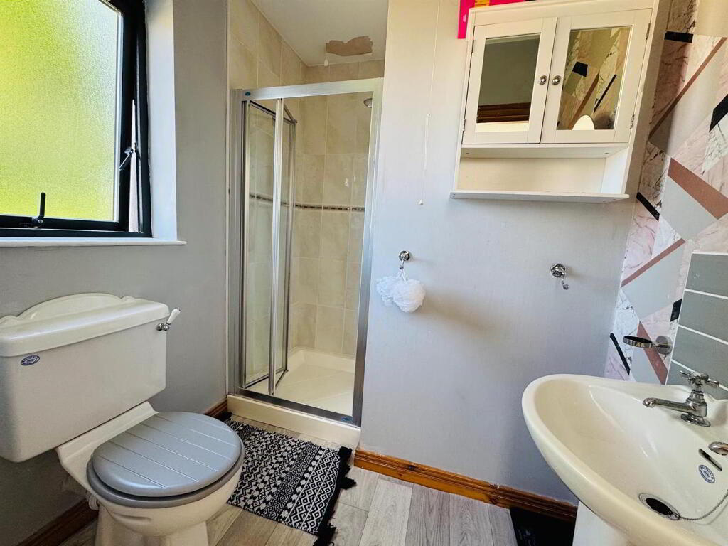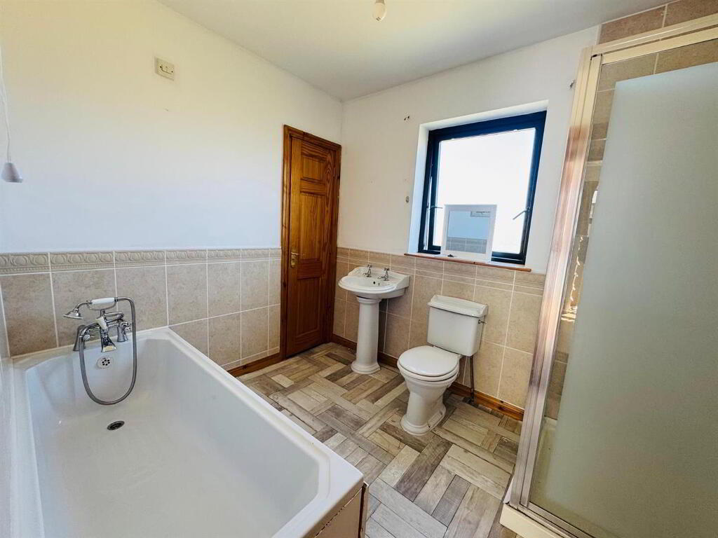 Comprising bath with shower fitting to taps, tiled walk in electric shower, whb and wc, 1/2 tiled walls, hotpress.