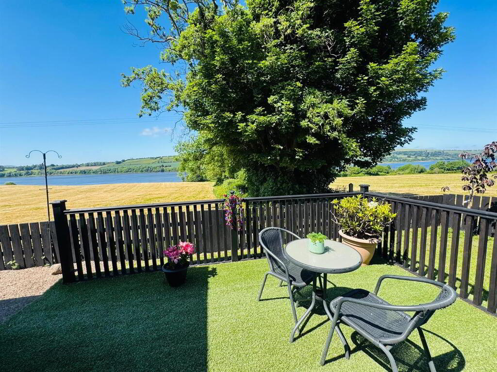 Decked patio area laid in artificial grass. Lawn to side. Spectacular views over river to rear. Enclosed to rear by fence and gate. Tarmac parking.