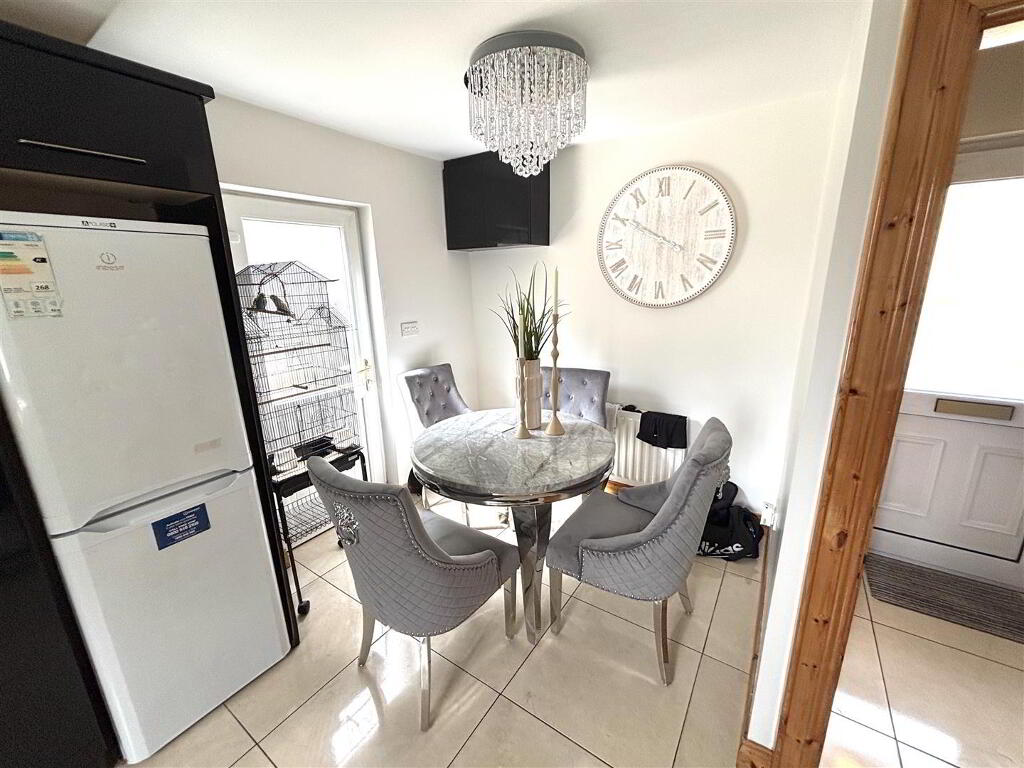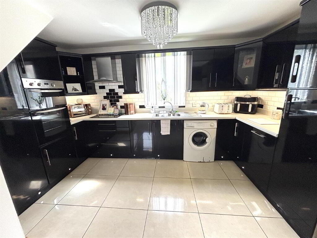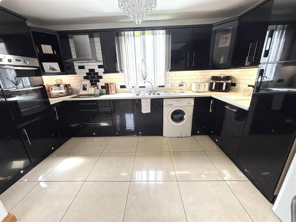 Fitted with a range of eye and low level units with matching worktop. Tiled around units. Under unit lighting. Stainless steel sink unit. Built in hob and oven. Extractor fan and light. Plumbed for automatic washing machine. Glass display unit. Pelmet over window. Tiled flooring.