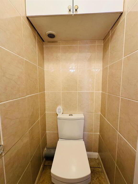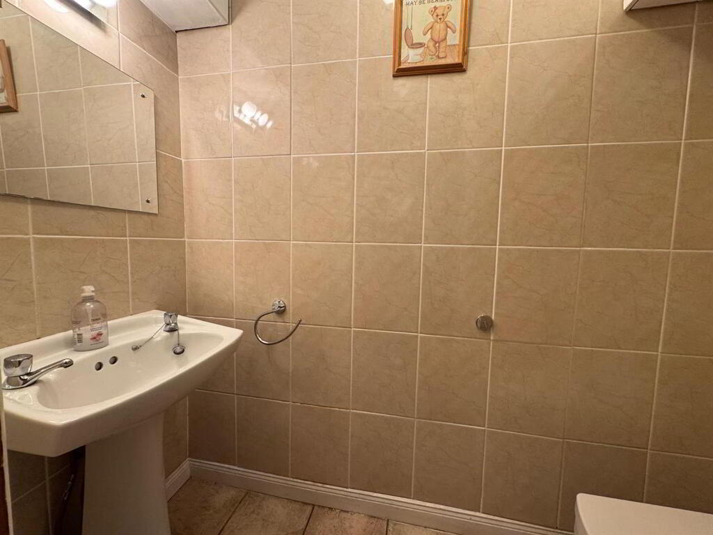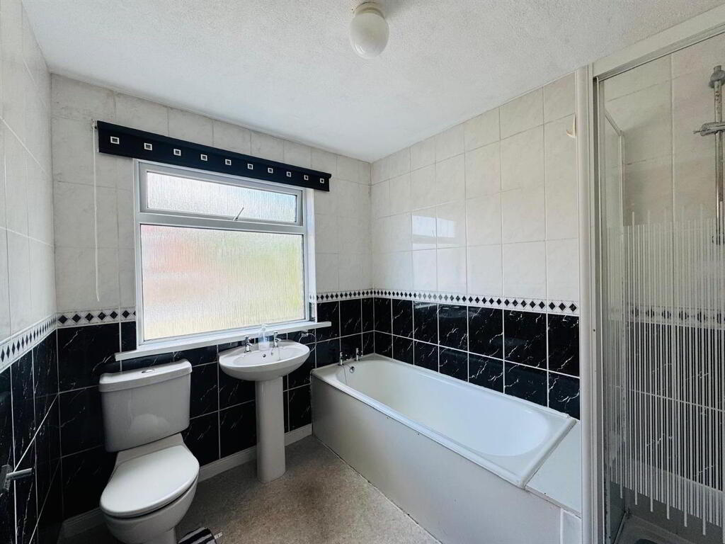 Comprising bath, walk in electric shower, whb and wc, fully tiled walls.