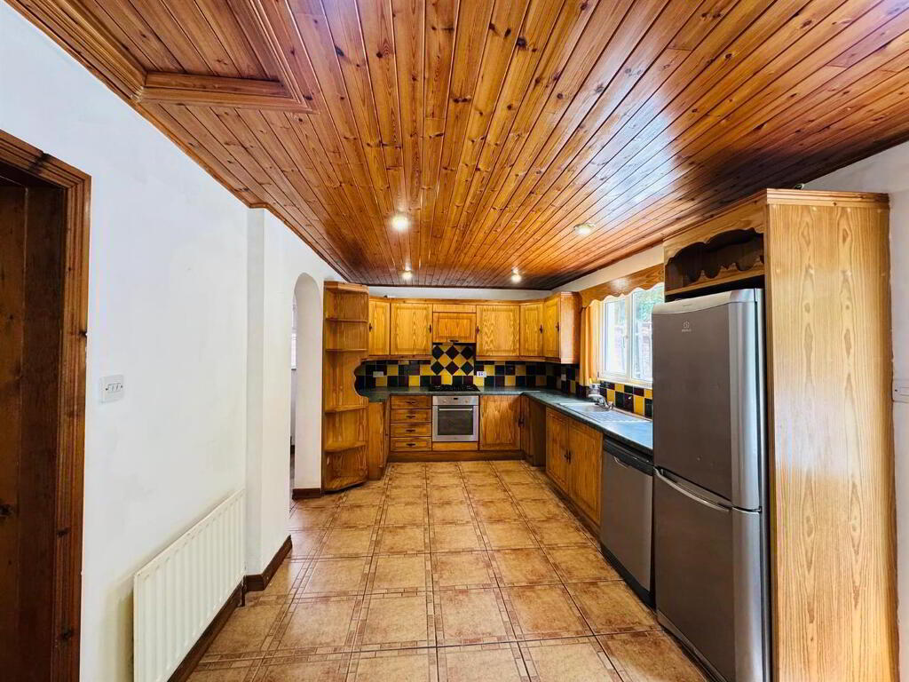 Having range of eye and low level units, tiling between units, single drainer stainless steel sink unit with mixer taps, gas hob, electric underoven, plumbed for washing machine and dishwasher, wooden ceiling with recessed lighting, tiled floor, open plan to Study.