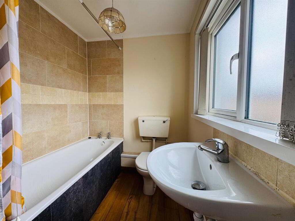 Comprising bath with shower over and tiling around, whb and wc, wooden floor.