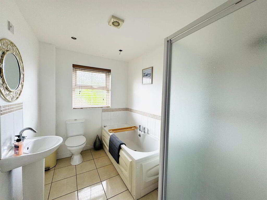 Comprising bath, fully tiled walk in electric shower, whb and wc, recessed lighting, tiled floor.