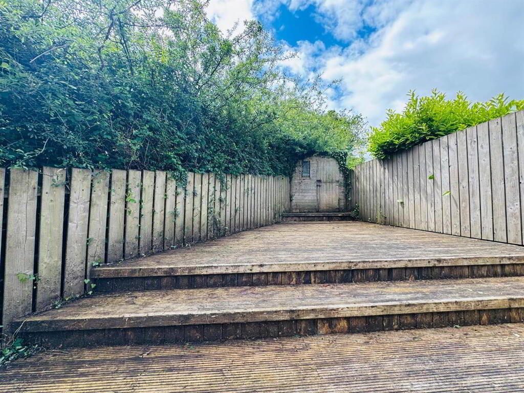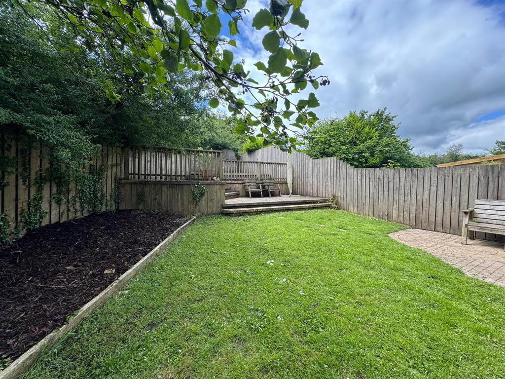 Paved parking. Neat lawn to rear leading to decked patio area. Enclosed yard to side with store. Steps to rear lawn.