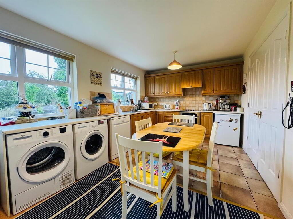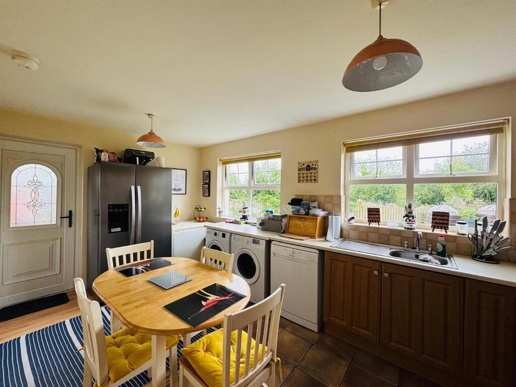 Having eye and low level units, tiling between units, hob, underoven, extractor hood, plumbed for washing machine and dishwasher, space for fridge/freezer, dining space, tiled floor.