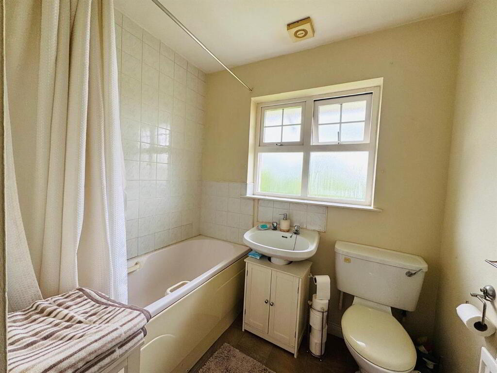 Comprising bath with electric shower over and part tiling around, whb set in vanity unit, wc.