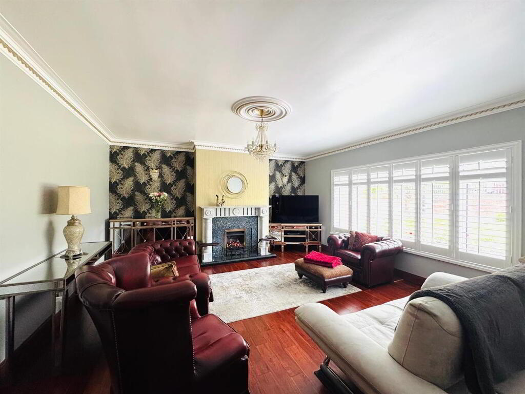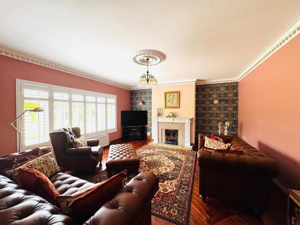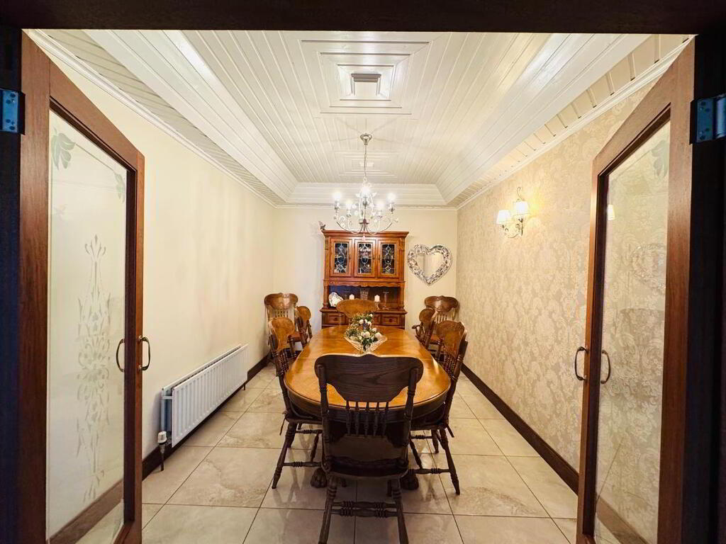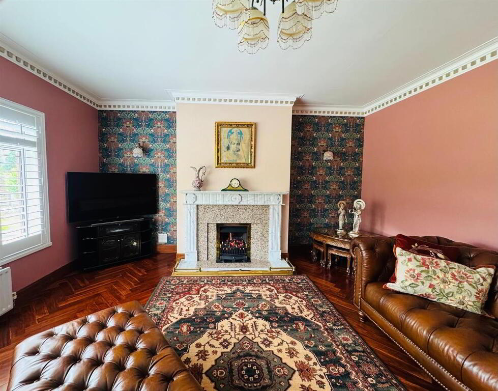 Having half height wood panelled walls, ceiling cornicing and centre rose, wall light points, walk in hotpress, double doors to Sun Lounge.