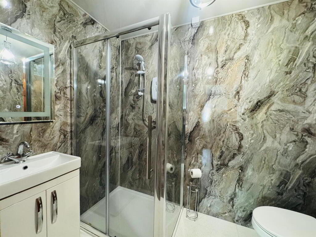 Comprising walk in shower, WHB set in vanity unit, WC, PVC cladding to walls, tiled floor.