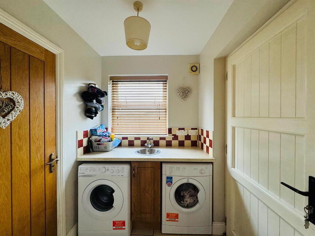 Having sink unit, plumbed for automatic washing machine, space for tumble dryer, tiled floor.