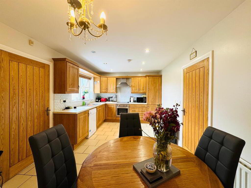 Having range of eye and low level units, 1 1/2 bowl stainless steel sink unit with mixer taps, hob & under oven, stainless steel extractor hood, plumbed for dishwasher, integrated fridge/freezer, dining space, tiled floor.
