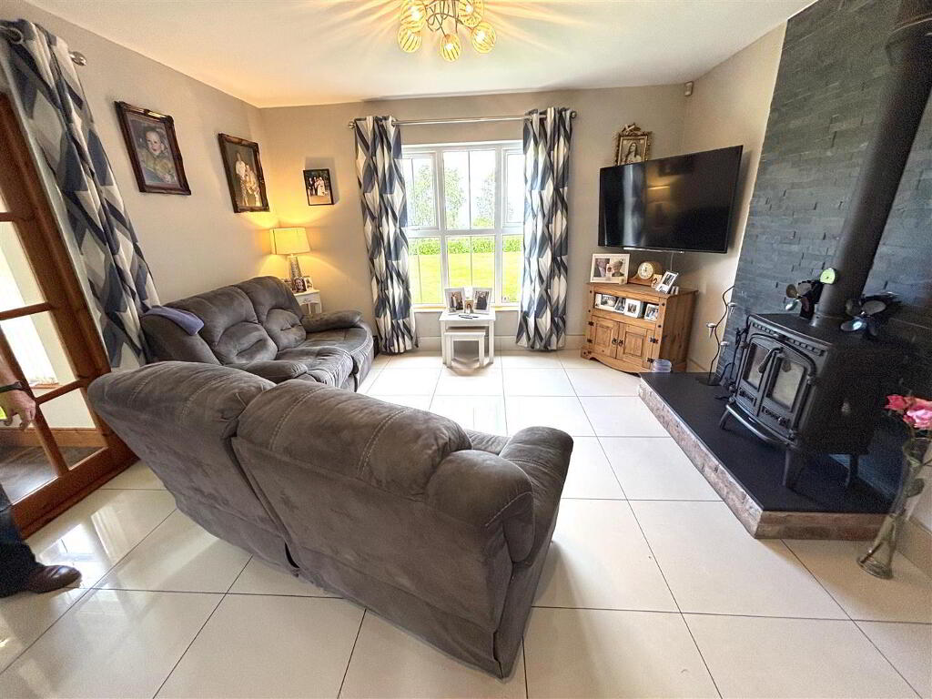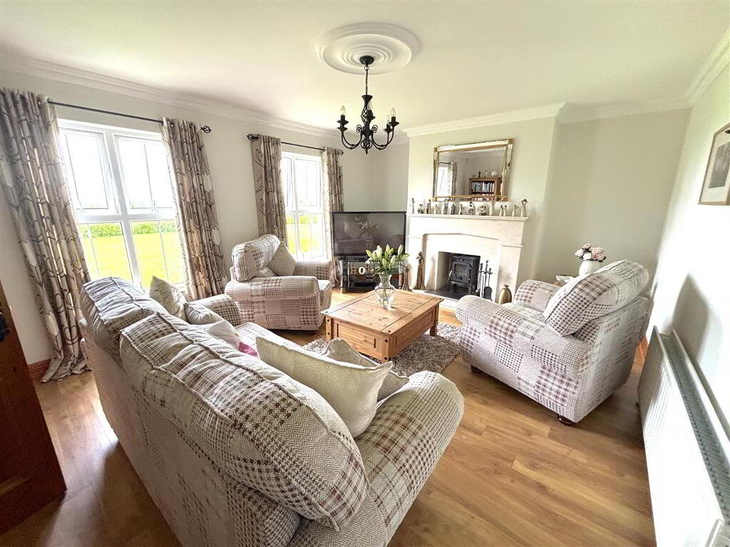 Sand stone effect fireplace with matching inset and hearth. Multi fuel stove. Points for wall lights. Solid wood flooring. Coving around ceiling.