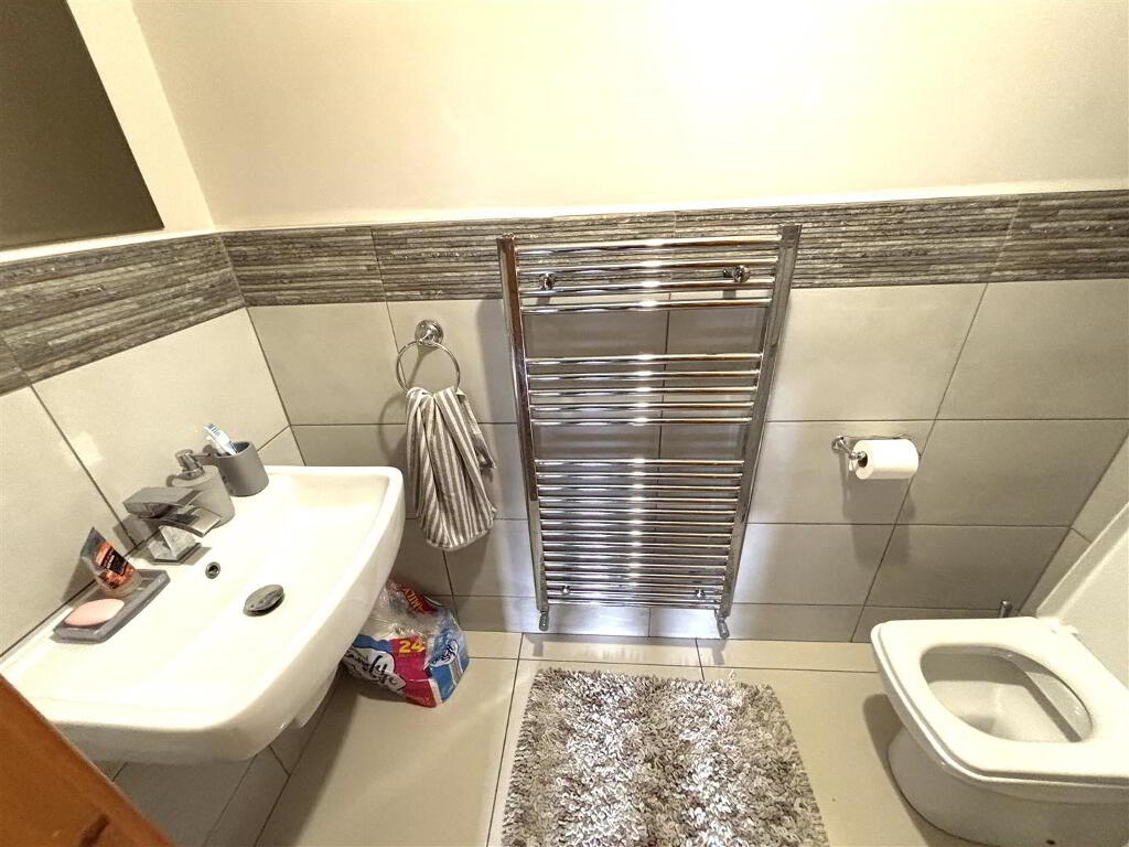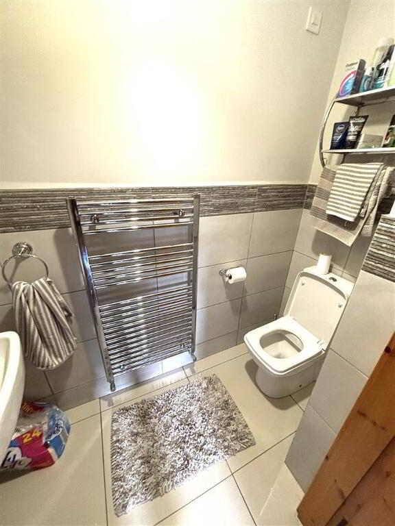Low Flush W.C. Wall mounted wash hand basin. Tiled flooring. Chrome heated towel rail. Part tiled walls. Extractor fan.